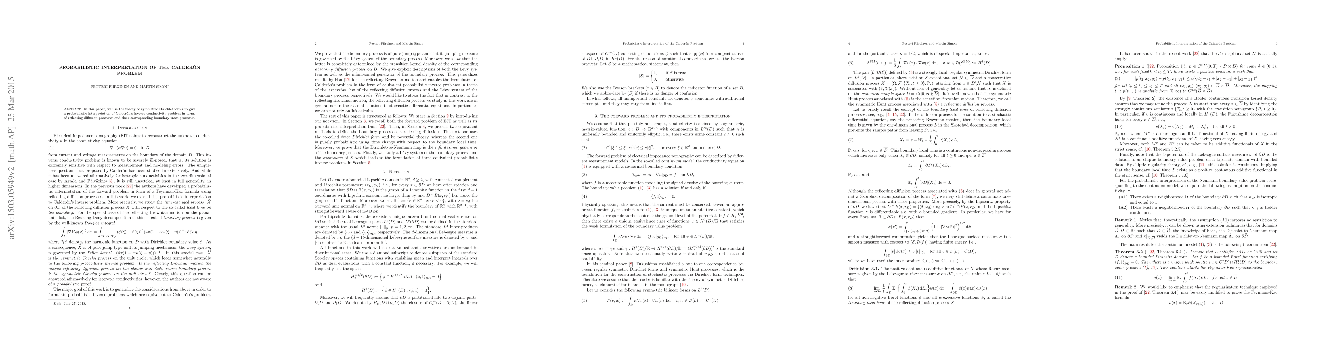In this paper, we use the theory of symmetric Dirichlet forms to give a probabilistic interpretation of Calder\'{o}n's inverse conductivity problem in terms of reflecting diffusion processes and their corresponding boundary trace processes.