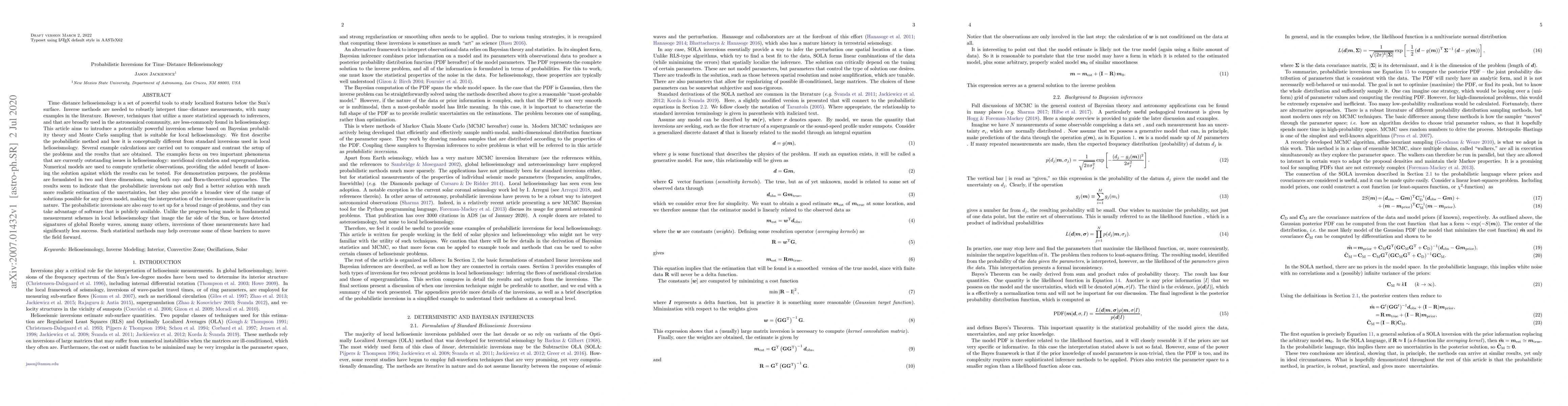This paper introduces a Bayesian probabilistic inversion method for time-distance helioseismology, contrasting it with traditional inversion techniques. The probabilistic approach provides more realistic uncertainty estimates and a broader range of possible solutions, demonstrated through studies of meridional circulation and supergranulation.