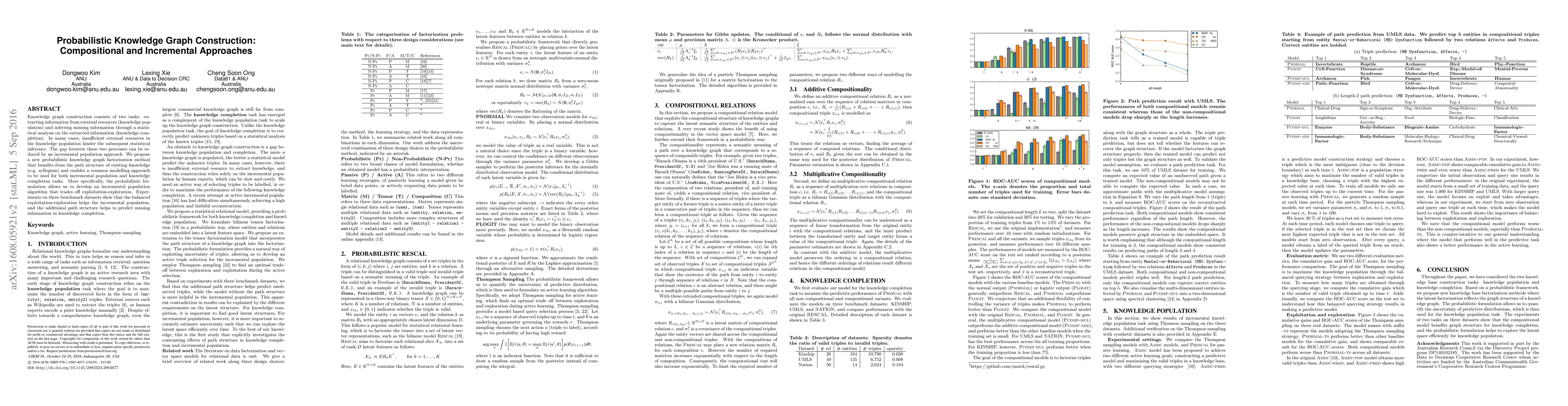 Knowledge graph construction consists of two tasks: extracting information from external resources (knowledge population) and inferring missing information through a statistical analysis on the extracted information (knowledge completion). In many cases, insufficient external resources in the knowledge population hinder the subsequent statistical inference. The gap between these two processes can be reduced by an incremental population approach. We propose a new probabilistic knowledge graph factorisation method that benefits from the path structure of existing knowledge (e.g. syllogism) and enables a common modelling approach to be used for both incremental population and knowledge completion tasks. More specifically, the probabilistic formulation allows us to develop an incremental population algorithm that trades off exploitation-exploration. Experiments on three benchmark datasets show that the balanced exploitation-exploration helps the incremental population, and the additional path structure helps to predict missing information in knowledge completion.