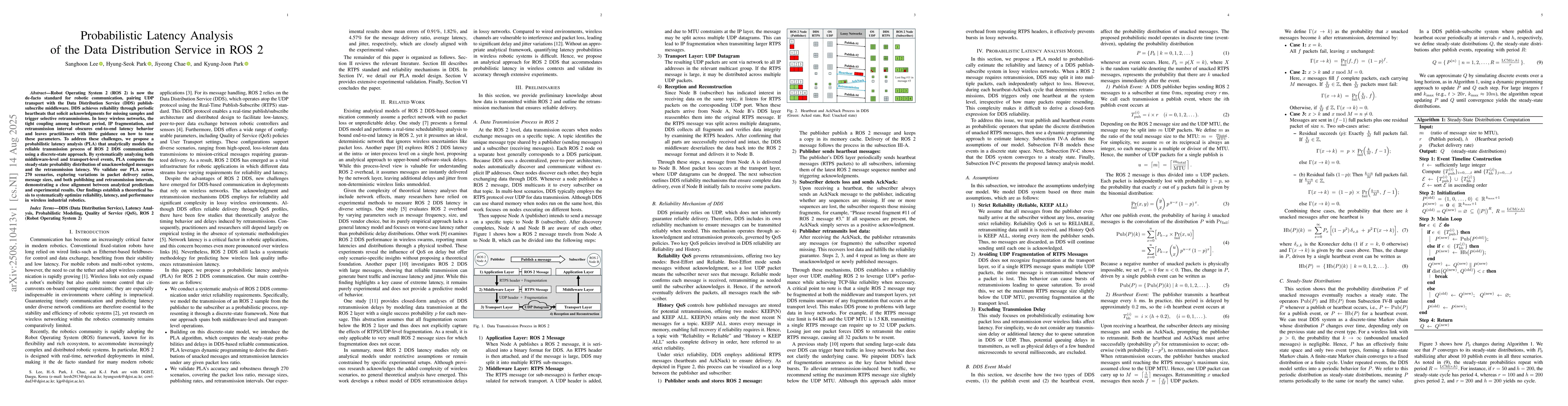 Robot Operating System 2 (ROS 2) is now the de facto standard for robotic communication, pairing UDP transport with the Data Distribution Service (DDS) publish-subscribe middleware. DDS achieves reliability through periodic heartbeats that solicit acknowledgments for missing samples and trigger selective retransmissions. In lossy wireless networks, the tight coupling among heartbeat period, IP fragmentation, and retransmission interval obscures end to end latency behavior and leaves practitioners with little guidance on how to tune these parameters. To address these challenges, we propose a probabilistic latency analysis (PLA) that analytically models the reliable transmission process of ROS 2 DDS communication using a discrete state approach. By systematically analyzing both middleware level and transport level events, PLA computes the steady state probability distribution of unacknowledged messages and the retransmission latency. We validate our PLA across 270 scenarios, exploring variations in packet delivery ratios, message sizes, and both publishing and retransmission intervals, demonstrating a close alignment between analytical predictions and experimental results. Our findings establish a theoretical basis to systematically optimize reliability, latency, and performance in wireless industrial robotics.