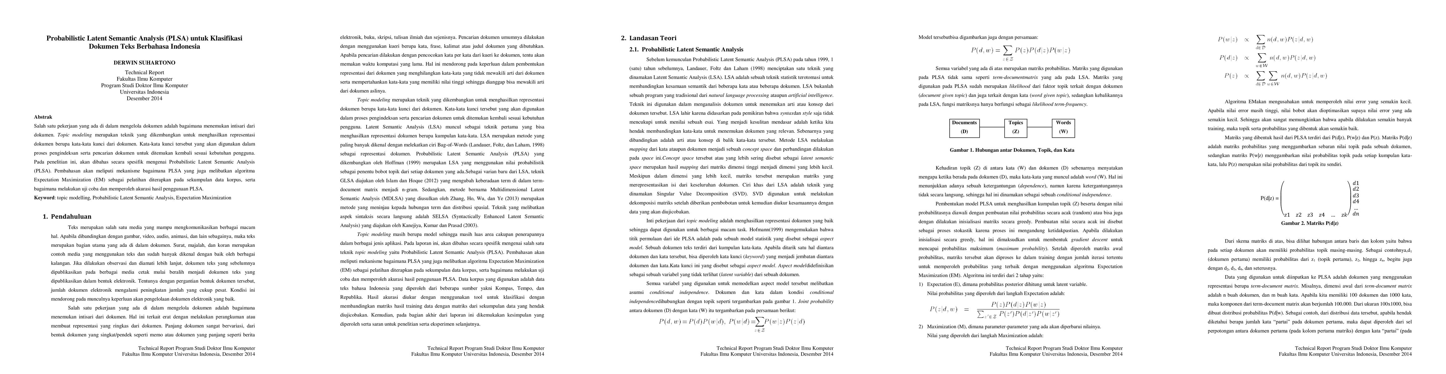 This research explores Probabilistic Latent Semantic Analysis (PLSA) for classifying Indonesian documents. It details PLSA's mechanism using Expectation Maximization (EM) for training, testing procedures, and evaluates the accuracy of the classification.