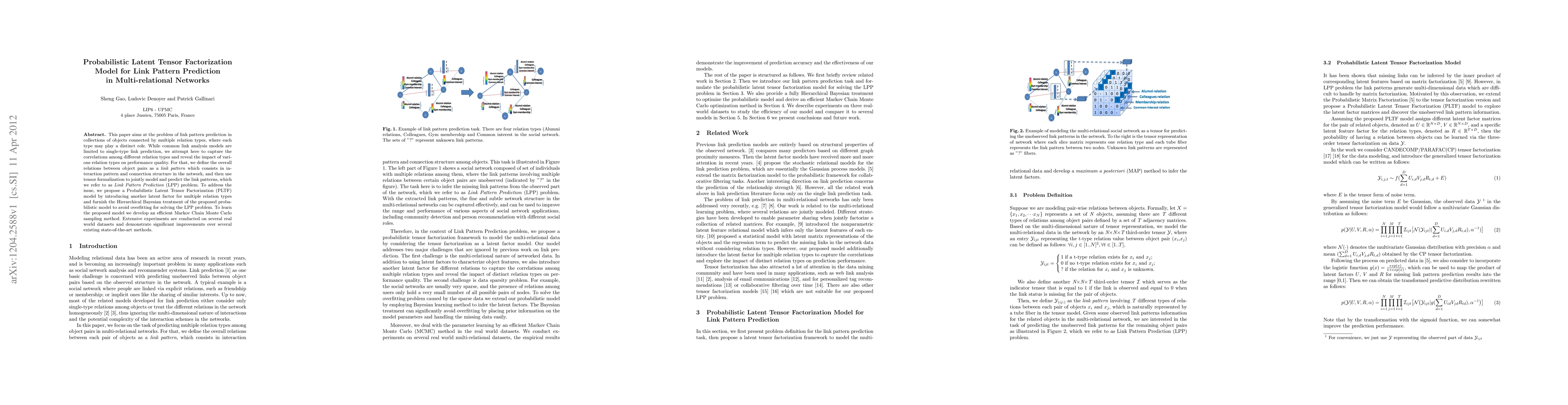 Probabilistic Latent Tensor Factorization (PLTF) model is proposed for Link Pattern Prediction (LPP) in multi-relational networks