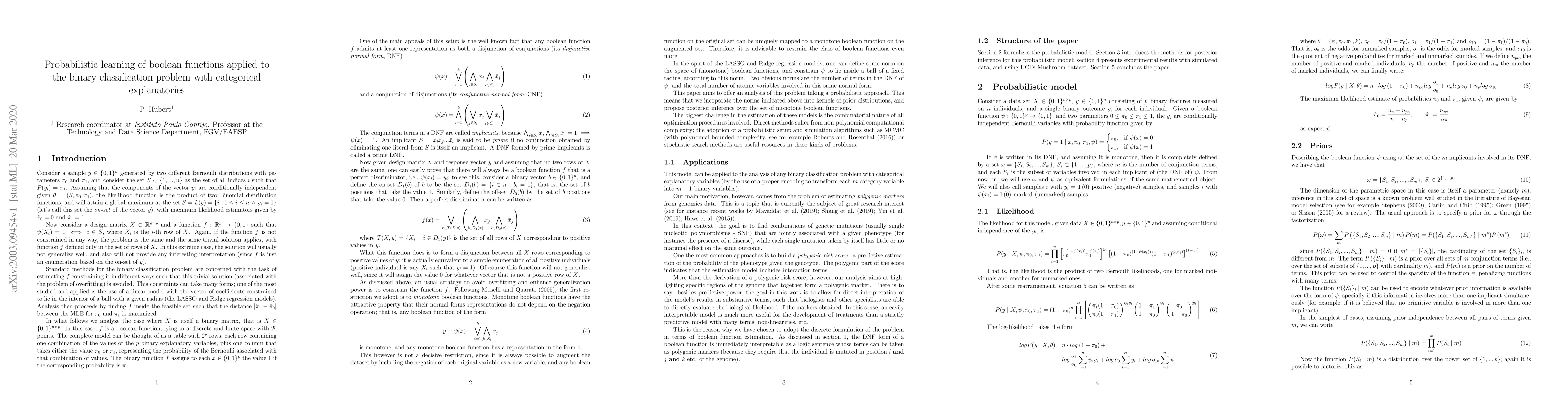 In this work we cast the problem of binary classification in terms of estimating a partition on Bernoulli data. When the explanatory variables are all categorical, the problem can be modelled using the language of boolean functions. We offer a probabilistic analysis of the problem, and propose two algorithms for learning boolean functions from binary data.