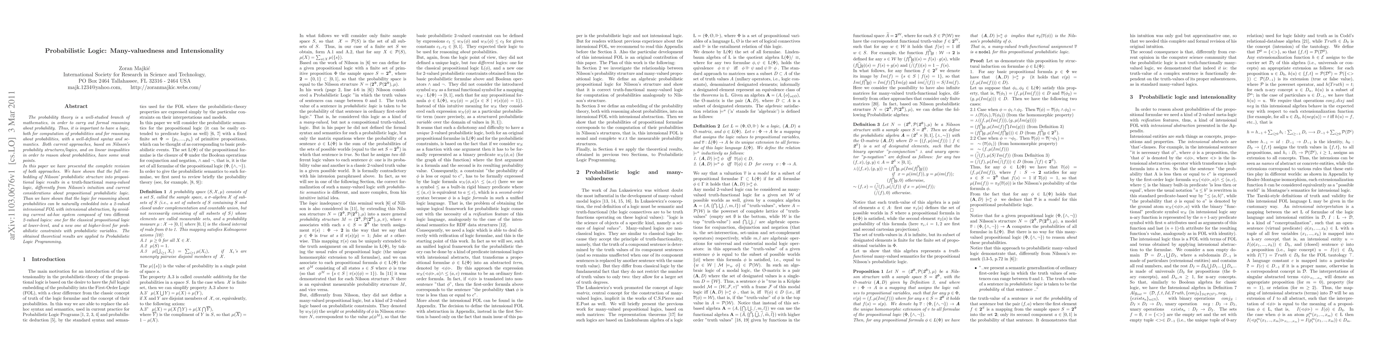 The probability theory is a well-studied branch of mathematics, in order to carry out formal reasoning about probability. Thus, it is important to have a logic, both for computation of probabilities and for reasoning about probabilities, with a well-defined syntax and semantics. Both current approaches, based on Nilsson's probability structures/logics, and on linear inequalities in order to reason about probabilities, have some weak points. In this paper we have presented the complete revision of both approaches. We have shown that the full embedding of Nilsson'probabilistic structure into propositional logic results in a truth-functional many-valued logic, differently from Nilsson's intuition and current considerations about propositional probabilistic logic. Than we have shown that the logic for reasoning about probabilities can be naturally embedded into a 2-valued intensional FOL with intensional abstraction, by avoiding current ad-hoc system composed of two different 2-valued logics: one for the classical propositional logic at lower-level, and a new one at higher-level for probabilistic constraints with probabilistic variables. The obtained theoretical results are applied to Probabilistic Logic Programming.