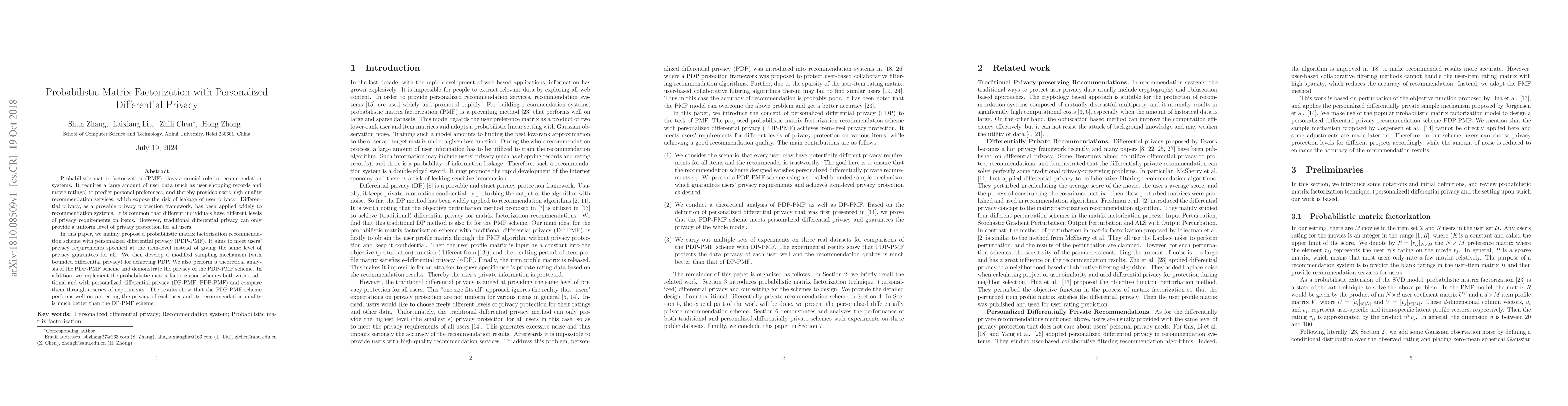 This paper proposes a probabilistic matrix factorization recommendation scheme with personalized differential privacy (PDP-PMF) to address varying privacy requirements for different users. The PDP-PMF scheme provides item-level privacy protection, outperforming traditional uniform differential privacy in both privacy preservation and recommendation quality.