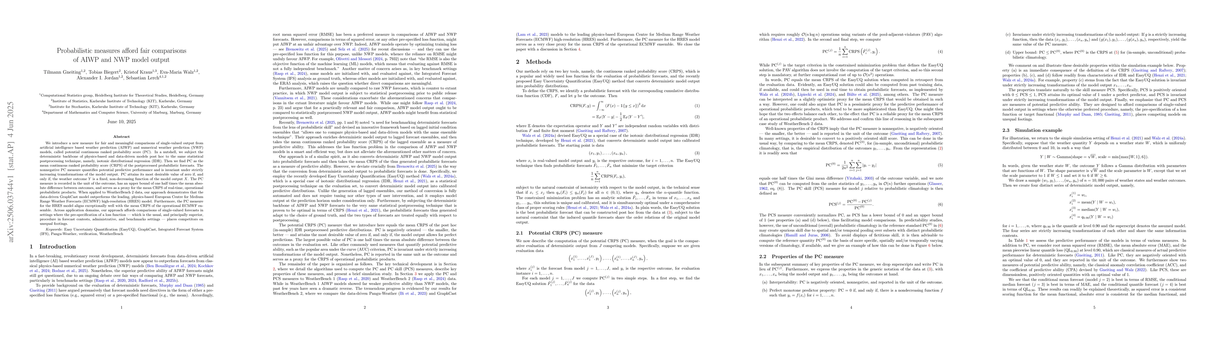 The research introduces a new measure, potential continuous ranked probability score (PC), for comparing AIWP and NWP model outputs. It involves post-hoc application of isotonic distributional regression (IDR) to both physics-based and data-driven models' deterministic outputs, followed by calculation of PC as the mean CRPS of the postprocessed probabilistic forecasts.