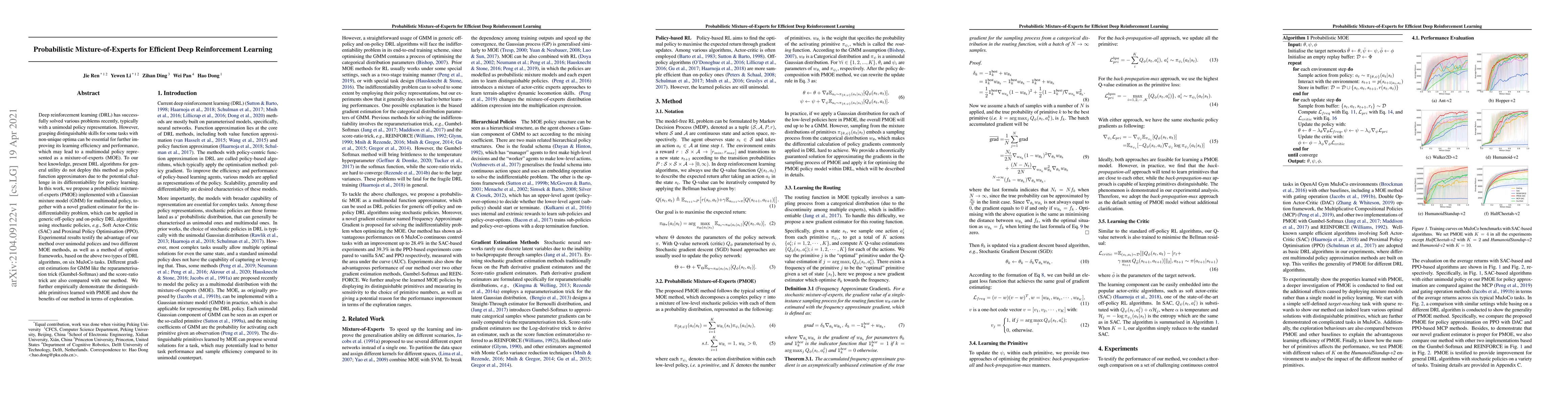 This paper proposes a probabilistic mixture-of-experts (PMOE) using a Gaussian mixture model for multimodal policy representation in deep reinforcement learning (DRL). It introduces a novel gradient estimator to address the differentiability challenge, demonstrating improved performance and exploration over unimodal policies and other MOE methods on six MuJoCo tasks.