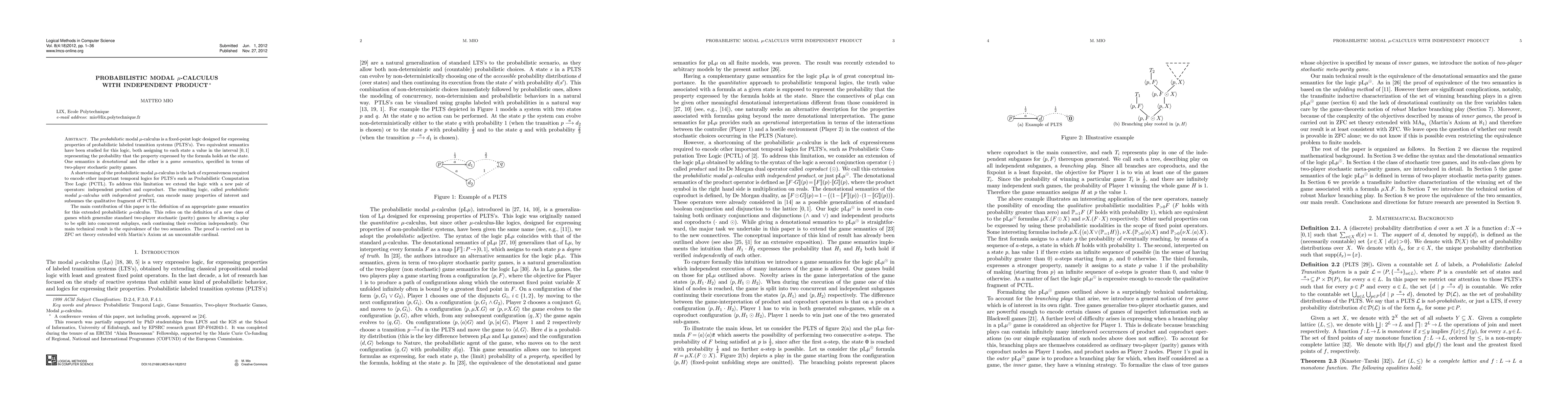 The probabilistic modal {\mu}-calculus is a fixed-point logic designed for expressing properties of probabilistic labeled transition systems (PLTS's). Two equivalent semantics have been studied for this logic, both assigning to each state a value in the interval [0,1] representing the probability that the property expressed by the formula holds at the state. One semantics is denotational and the other is a game semantics, specified in terms of two-player stochastic parity games. A shortcoming of the probabilistic modal {\mu}-calculus is the lack of expressiveness required to encode other important temporal logics for PLTS's such as Probabilistic Computation Tree Logic (PCTL). To address this limitation we extend the logic with a new pair of operators: independent product and coproduct. The resulting logic, called probabilistic modal {\mu}-calculus with independent product, can encode many properties of interest and subsumes the qualitative fragment of PCTL. The main contribution of this paper is the definition of an appropriate game semantics for this extended probabilistic {\mu}-calculus. This relies on the definition of a new class of games which generalize standard two-player stochastic (parity) games by allowing a play to be split into concurrent subplays, each continuing their evolution independently. Our main technical result is the equivalence of the two semantics. The proof is carried out in ZFC set theory extended with Martin's Axiom at an uncountable cardinal.
