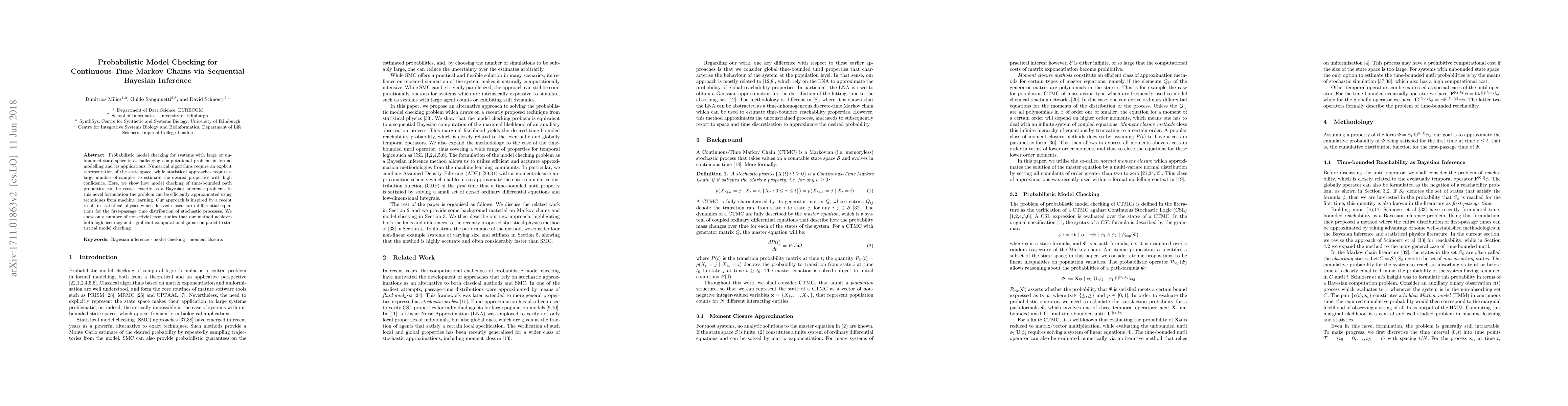 Probabilistic model checking for systems with large or unbounded state space is a challenging computational problem in formal modelling and its applications. Numerical algorithms require an explicit representation of the state space, while statistical approaches require a large number of samples to estimate the desired properties with high confidence. Here, we show how model checking of time-bounded path properties can be recast exactly as a Bayesian inference problem. In this novel formulation the problem can be efficiently approximated using techniques from machine learning. Our approach is inspired by a recent result in statistical physics which derived closed form differential equations for the first-passage time distribution of stochastic processes. We show on a number of non-trivial case studies that our method achieves both high accuracy and significant computational gains compared to statistical model checking.