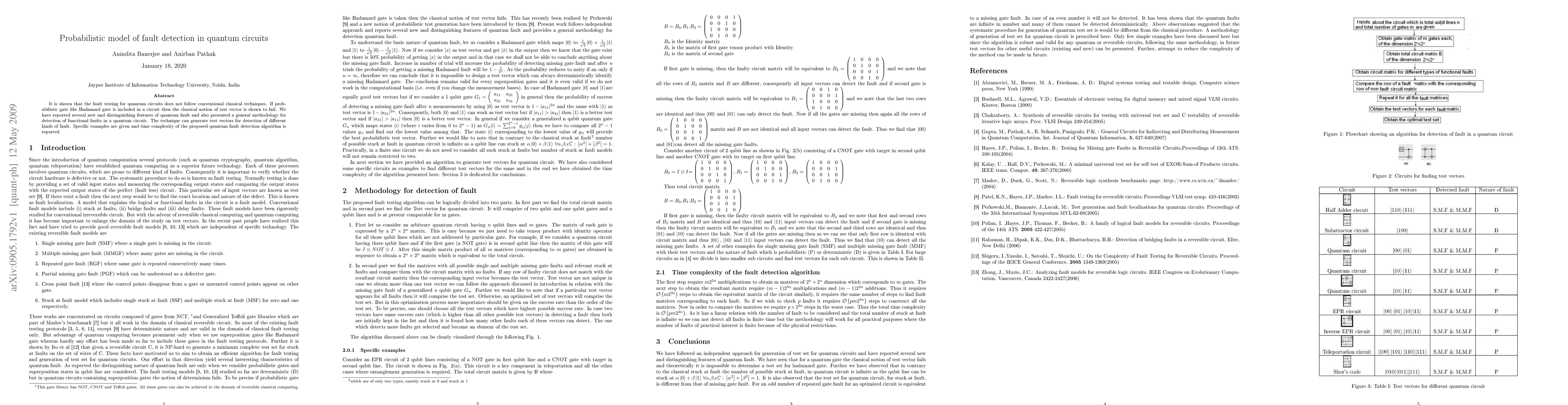 It is shown that the fault testing for quantum circuits does not follow conventional classical techniques. If probabilistic gate like Hadamard gate is included in a circuit then the classical notion of test vector is shown to fail. We have reported several new and distinguishing features of quantum fault and also presented a general methodology for detection of functional faults in a quantum circuit. The technique can generate test vectors for detection of different kinds of fault. Specific examples are given and time complexity of the proposed quantum fault detection algorithm is reported.
