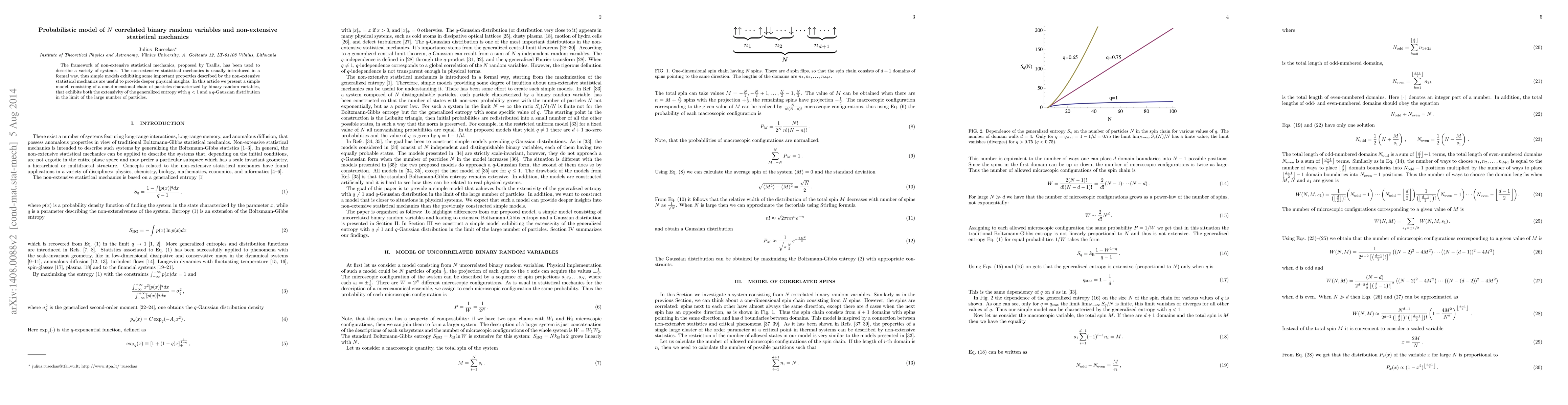 This paper introduces a probabilistic model of N correlated binary random variables that aligns with non-extensive statistical mechanics, demonstrating the extensivity of generalized entropy for q<1 and a q-Gaussian distribution in large particle systems. The model provides deeper insights into the properties described by Tsallis' non-extensive statistical mechanics.