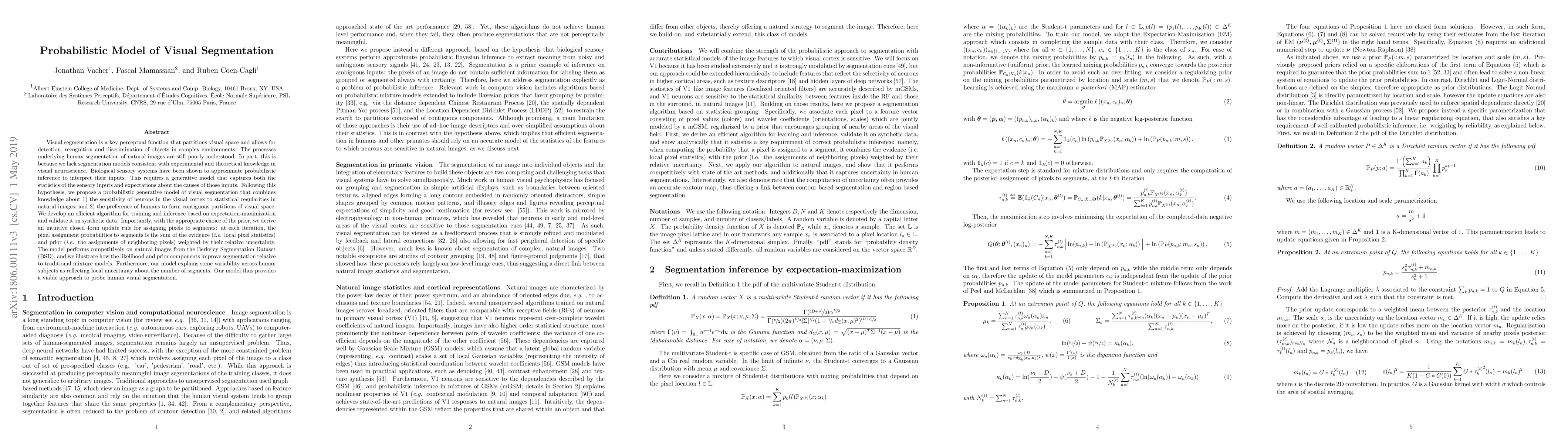 Visual segmentation is a key perceptual function that partitions visual space and allows for detection, recognition and discrimination of objects in complex environments. The processes underlying human segmentation of natural images are still poorly understood. In part, this is because we lack segmentation models consistent with experimental and theoretical knowledge in visual neuroscience. Biological sensory systems have been shown to approximate probabilistic inference to interpret their inputs. This requires a generative model that captures both the statistics of the sensory inputs and expectations about the causes of those inputs. Following this hypothesis, we propose a probabilistic generative model of visual segmentation that combines knowledge about 1) the sensitivity of neurons in the visual cortex to statistical regularities in natural images; and 2) the preference of humans to form contiguous partitions of visual space. We develop an efficient algorithm for training and inference based on expectation-maximization and validate it on synthetic data. Importantly, with the appropriate choice of the prior, we derive an intuitive closed--form update rule for assigning pixels to segments: at each iteration, the pixel assignment probabilities to segments is the sum of the evidence (i.e. local pixel statistics) and prior (i.e. the assignments of neighboring pixels) weighted by their relative uncertainty. The model performs competitively on natural images from the Berkeley Segmentation Dataset (BSD), and we illustrate how the likelihood and prior components improve segmentation relative to traditional mixture models. Furthermore, our model explains some variability across human subjects as reflecting local uncertainty about the number of segments. Our model thus provides a viable approach to probe human visual segmentation.