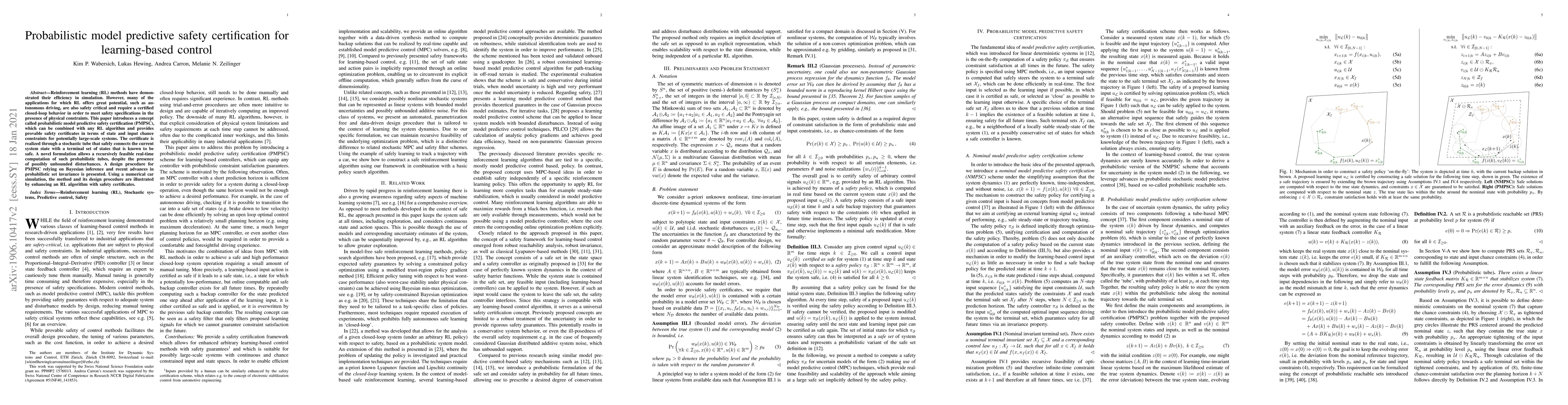 This paper introduces a probabilistic model predictive safety certification (PMPSC) method that combines with reinforcement learning algorithms to provide provable safety certificates for large-scale systems, ensuring safety specifications in the presence of physical constraints. The method uses a stochastic tube and convex receding horizon formulation for real-time computation, illustrated through a car simulation enhancing a basic RL algorithm with safety guarantees.
