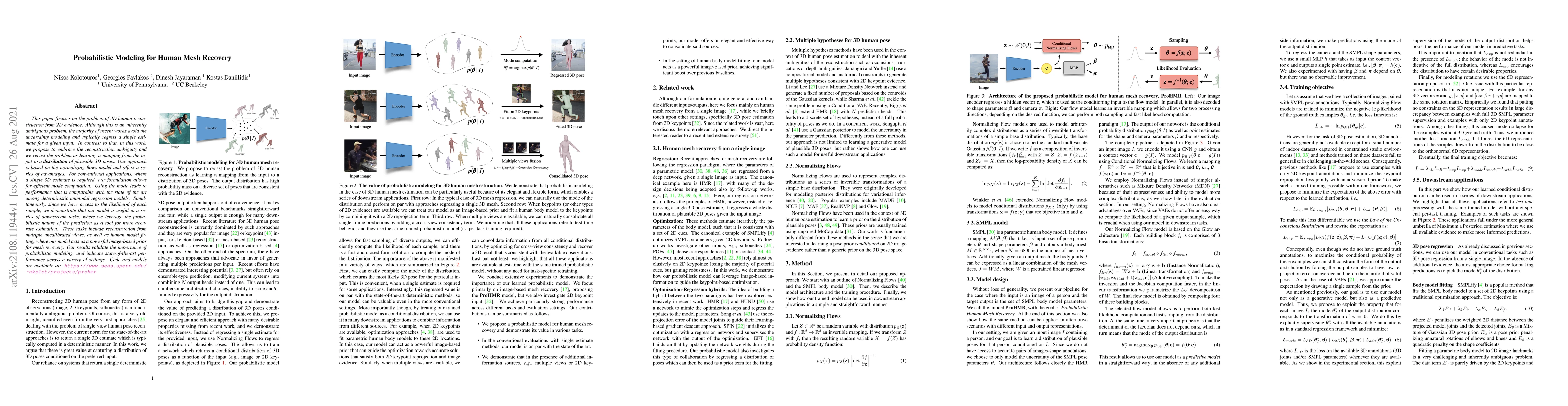 Researchers developed a probabilistic 3D human reconstruction model that offers state-of-the-art performance and can handle uncertainty in the input data. The approach allows for efficient mode computation and has applications in downstream tasks such as multi-view reconstruction and mesh fitting.