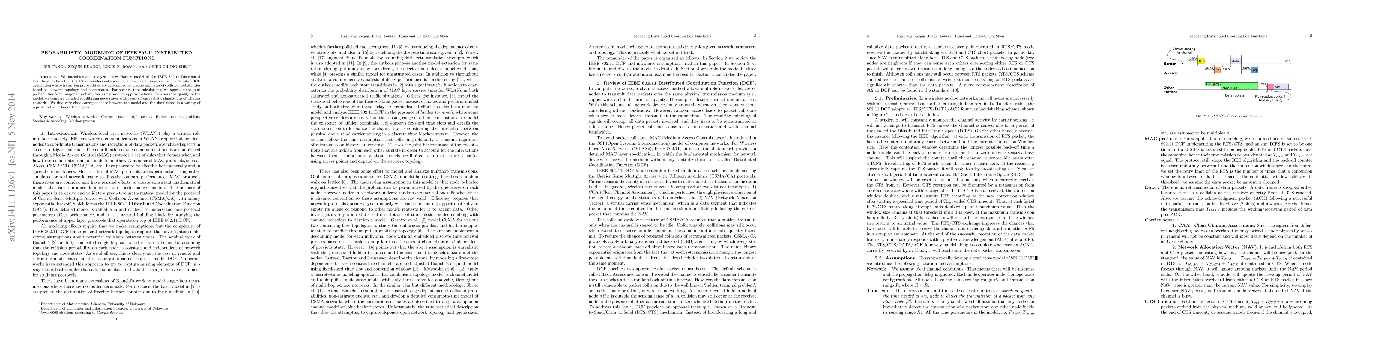 We introduce and analyze a new Markov model of the IEEE 802.11 Distributed Coordination Function (DCF) for wireless networks. The new model is derived from a detailed DCF description where transition probabilities are determined by precise estimates of collision probabilities based on network topology and node states. For steady state calculations, we approximate joint probabilities from marginal probabilities using product approximations. To assess the quality of the model, we compare detailed equilibrium node states with results from realistic simulations of wireless networks. We find very close correspondence between the model and the simulations in a variety of representative network topologies.
