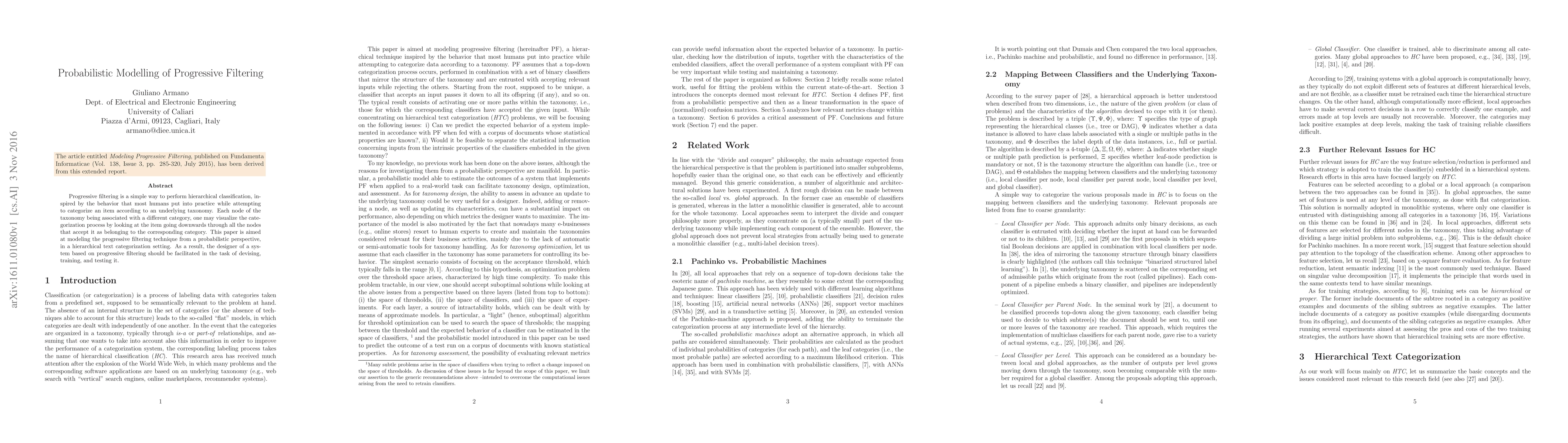 Progressive filtering is a simple way to perform hierarchical classification, inspired by the behavior that most humans put into practice while attempting to categorize an item according to an underlying taxonomy. Each node of the taxonomy being associated with a different category, one may visualize the categorization process by looking at the item going downwards through all the nodes that accept it as belonging to the corresponding category. This paper is aimed at modeling the progressive filtering technique from a probabilistic perspective, in a hierarchical text categorization setting. As a result, the designer of a system based on progressive filtering should be facilitated in the task of devising, training, and testing it.