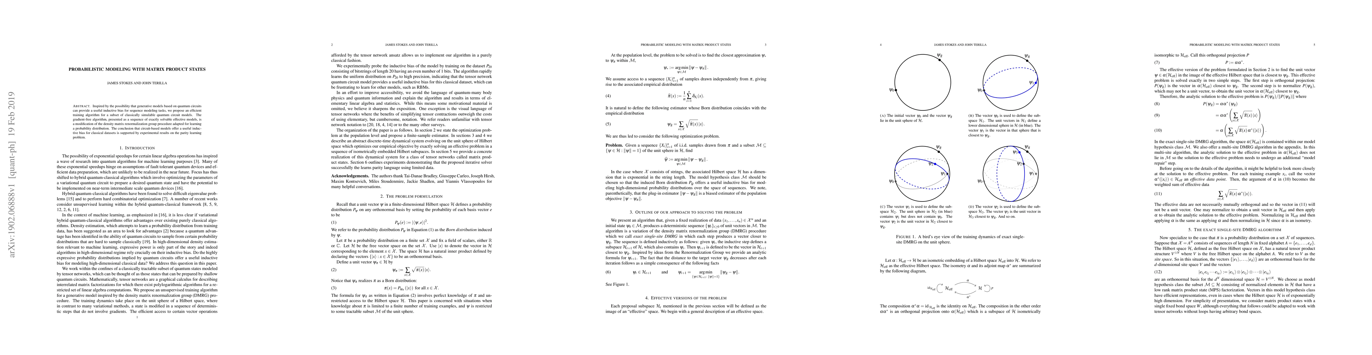 The paper introduces an efficient training algorithm for a subset of quantum circuit models, adapting the DMRG procedure for learning probability distributions, and provides a detailed description of the exact single-site DMRG algorithm.