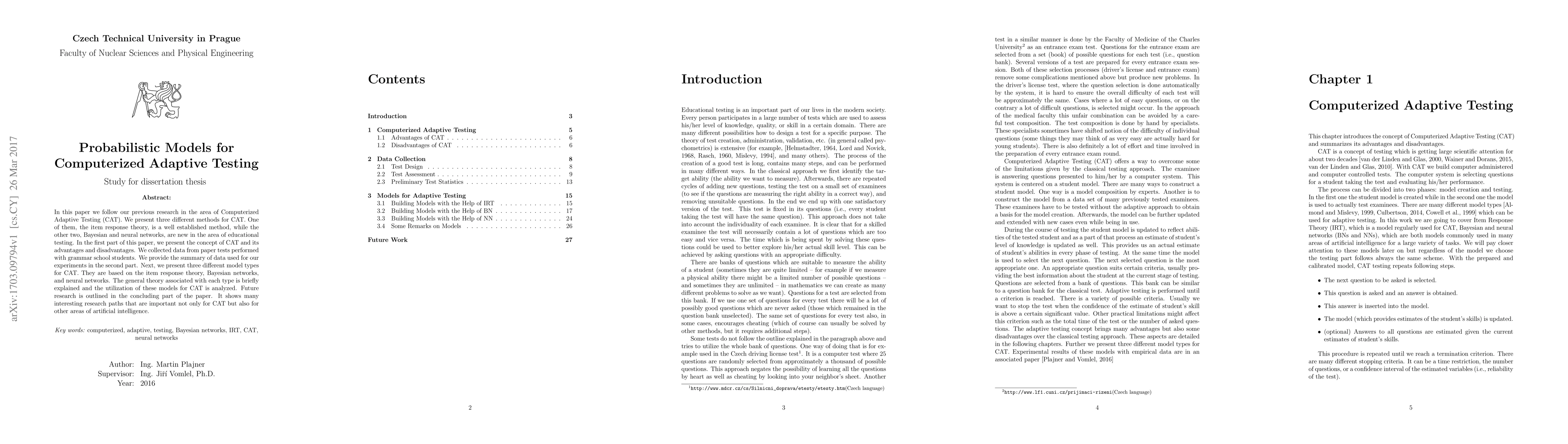This paper explores three methods for Computerized Adaptive Testing (CAT), including item response theory, Bayesian networks, and neural networks. It discusses the advantages and disadvantages of CAT and presents experimental data from grammar school students, followed by a detailed analysis of the three model types.