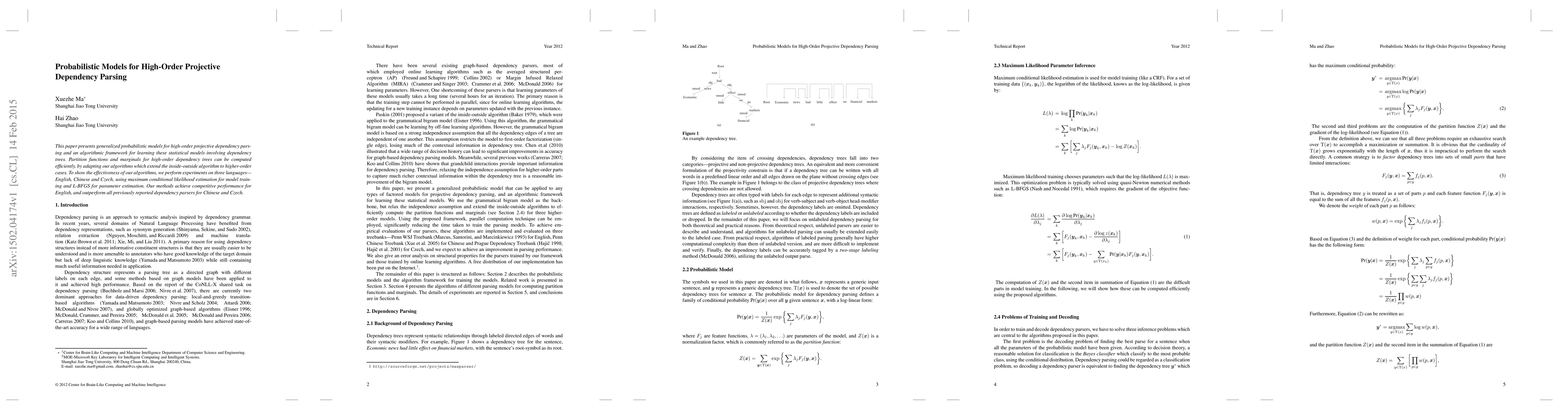 This paper introduces probabilistic models for high-order projective dependency parsing and an algorithmic framework for learning these models, achieving competitive results for English and outperforming previous parsers for Chinese and Czech. Experiments utilize maximum conditional likelihood and L-BFGS for parameter estimation.