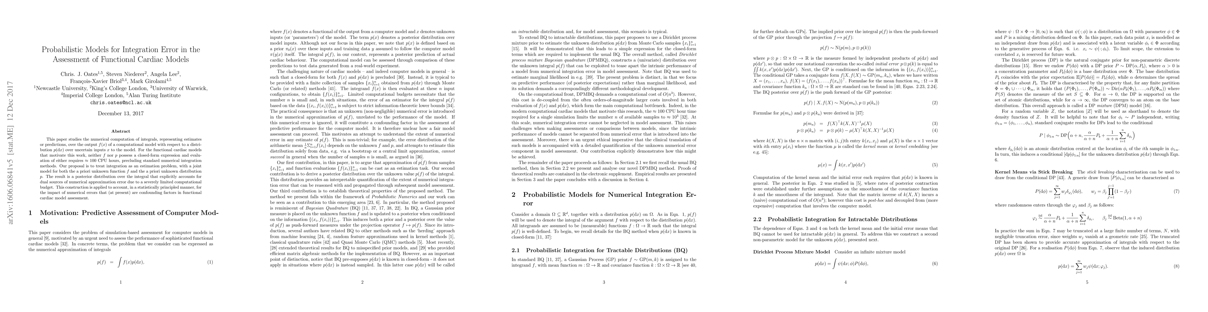 This paper studies the numerical computation of integrals, representing estimates or predictions, over the output $f(x)$ of a computational model with respect to a distribution $p(\mathrm{d}x)$ over uncertain inputs $x$ to the model. For the functional cardiac models that motivate this work, neither $f$ nor $p$ possess a closed-form expression and evaluation of either requires $\approx$ 100 CPU hours, precluding standard numerical integration methods. Our proposal is to treat integration as an estimation problem, with a joint model for both the a priori unknown function $f$ and the a priori unknown distribution $p$. The result is a posterior distribution over the integral that explicitly accounts for dual sources of numerical approximation error due to a severely limited computational budget. This construction is applied to account, in a statistically principled manner, for the impact of numerical errors that (at present) are confounding factors in functional cardiac model assessment.