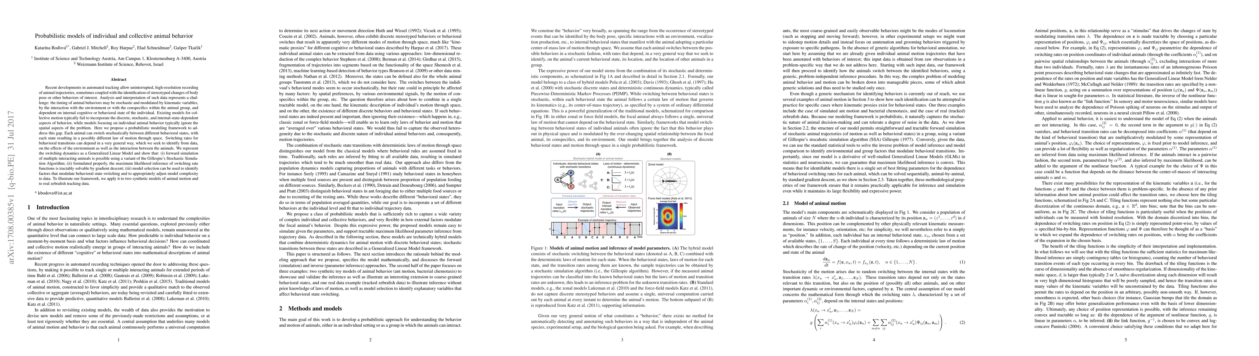 This paper proposes a probabilistic modeling framework to analyze individual and collective animal behavior, addressing the stochastic nature of behavioral transitions and interactions. The model uses a Generalized Linear Model to represent switching dynamics and employs a Stochastic Simulation Algorithm for forward simulation, with gradient descent for parameter inference. The framework is demonstrated on synthetic and real zebrafish tracking data.