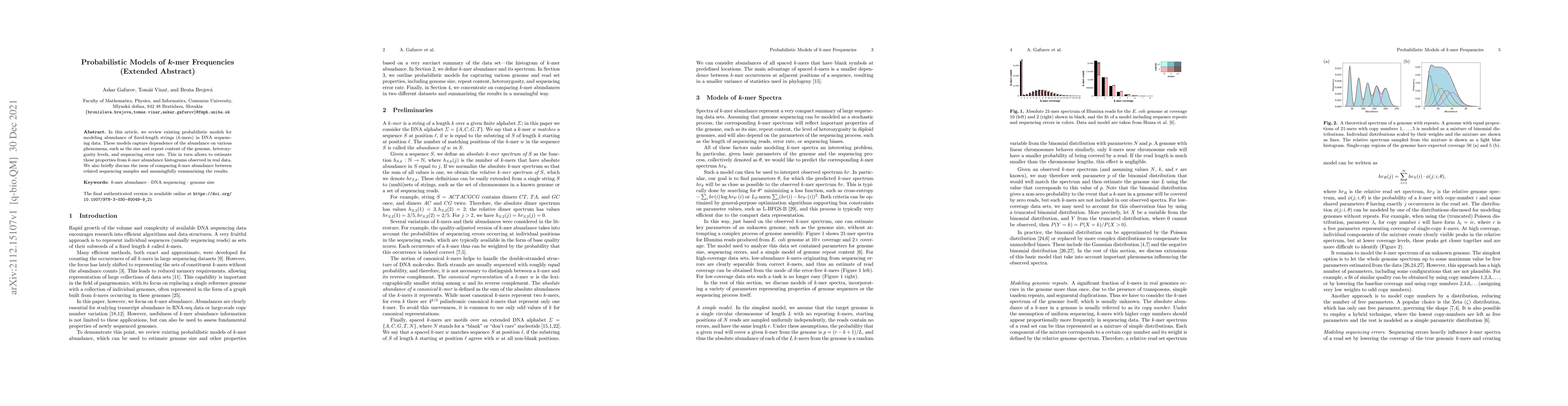 This paper reviews probabilistic models for analyzing k-mer frequencies in DNA sequencing data, allowing researchers to estimate genome properties from k-mer abundance histograms. It also discusses methods for comparing k-mer abundance between related samples and summarizing results.