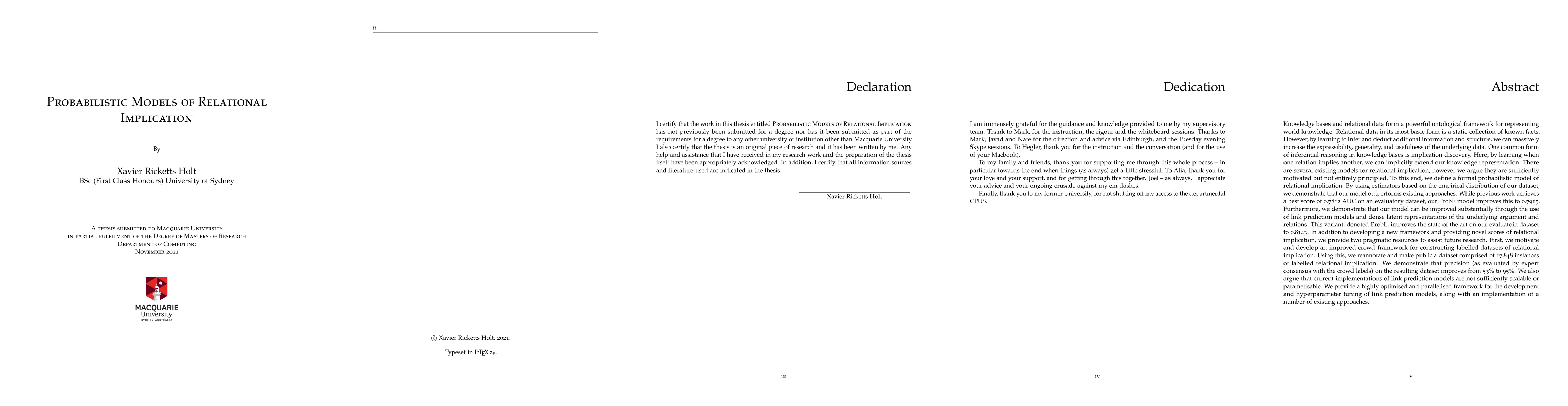 The research distinguishes itself by formulating relational implication probabilistically, introducing three model variants, and significantly improving performance through the use of link prediction models and dense latent representations.