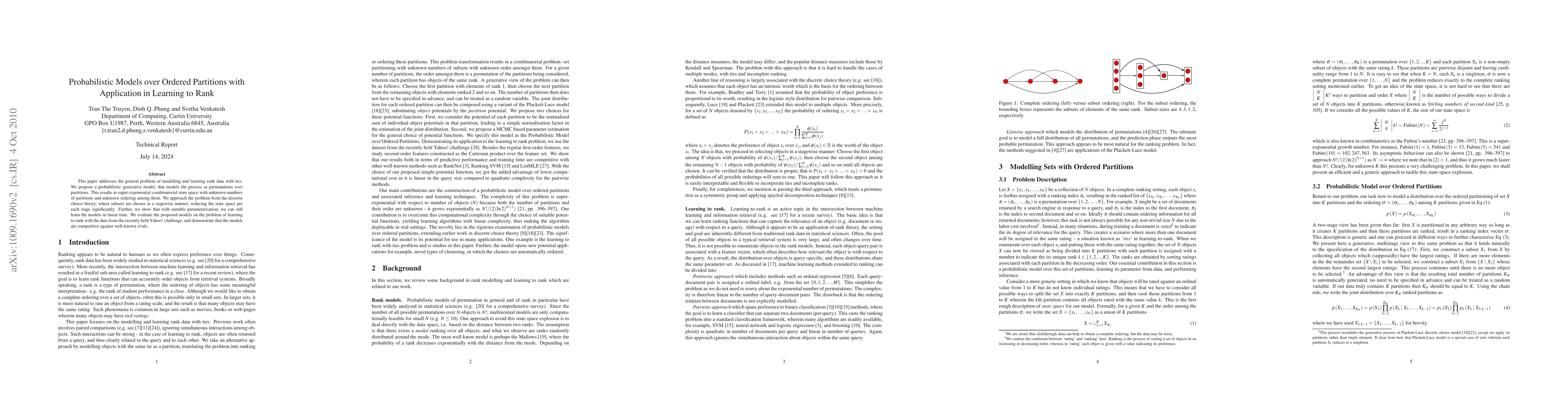 This paper addresses the general problem of modelling and learning rank data with ties. We propose a probabilistic generative model, that models the process as permutations over partitions. This results in super-exponential combinatorial state space with unknown numbers of partitions and unknown ordering among them. We approach the problem from the discrete choice theory, where subsets are chosen in a stagewise manner, reducing the state space per each stage significantly. Further, we show that with suitable parameterisation, we can still learn the models in linear time. We evaluate the proposed models on the problem of learning to rank with the data from the recently held Yahoo! challenge, and demonstrate that the models are competitive against well-known rivals.