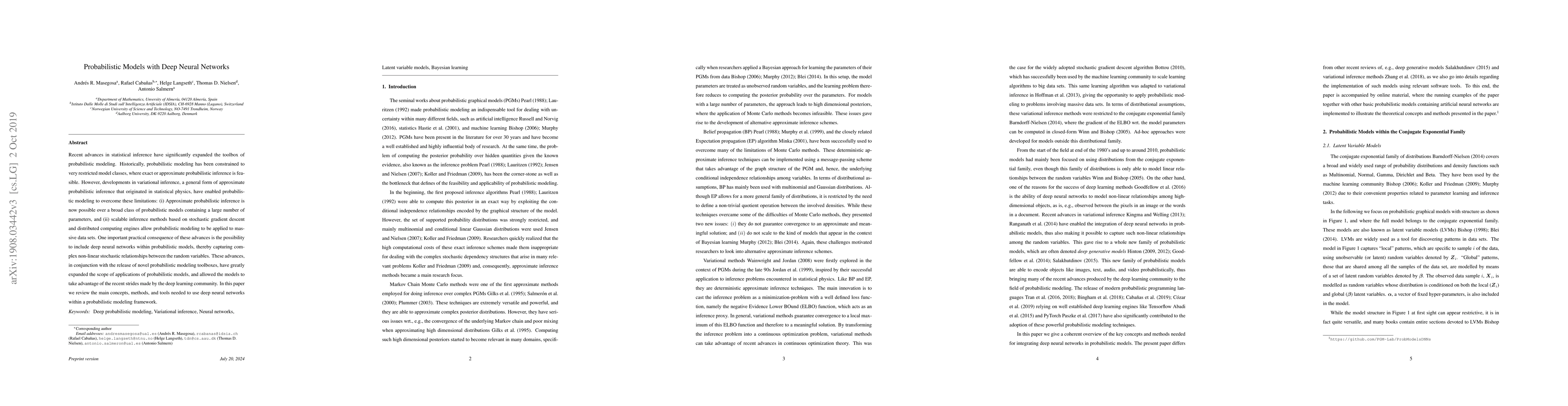 Recent advances in statistical inference have significantly expanded the toolbox of probabilistic modeling. Historically, probabilistic modeling has been constrained to (i) very restricted model classes where exact or approximate probabilistic inference were feasible, and (ii) small or medium-sized data sets which fit within the main memory of the computer. However, developments in variational inference, a general form of approximate probabilistic inference originated in statistical physics, are allowing probabilistic modeling to overcome these restrictions: (i) Approximate probabilistic inference is now possible over a broad class of probabilistic models containing a large number of parameters, and (ii) scalable inference methods based on stochastic gradient descent and distributed computation engines allow to apply probabilistic modeling over massive data sets. One important practical consequence of these advances is the possibility to include deep neural networks within a probabilistic model to capture complex non-linear stochastic relationships between random variables. These advances in conjunction with the release of novel probabilistic modeling toolboxes have greatly expanded the scope of application of probabilistic models, and allow these models to take advantage of the recent strides made by the deep learning community. In this paper we review the main concepts, methods and tools needed to use deep neural networks within a probabilistic modeling framework.
