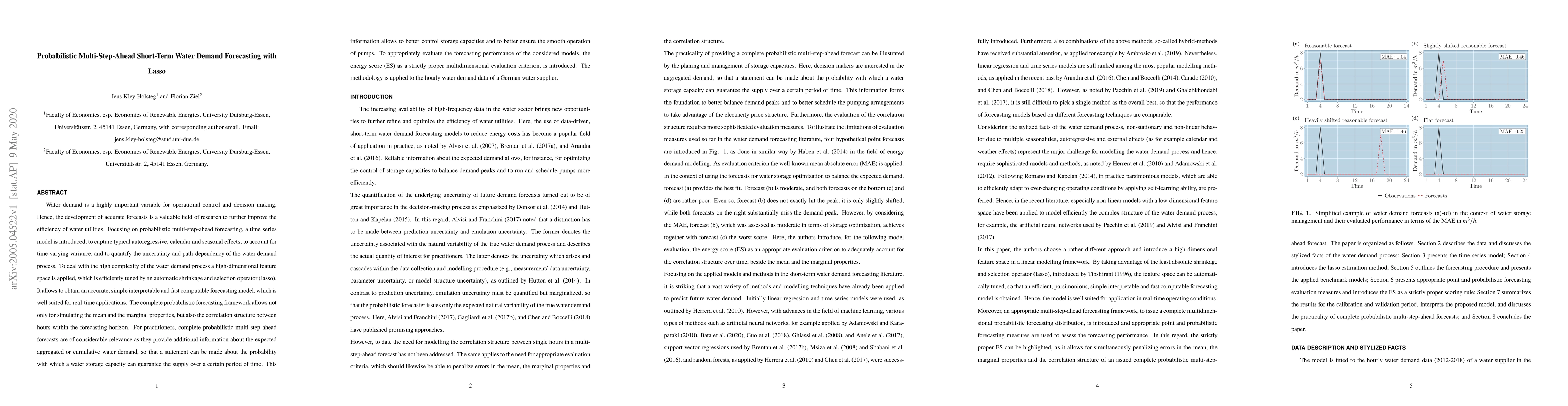 This paper introduces a probabilistic multi-step-ahead forecasting model for short-term water demand using Lasso to handle high-dimensional feature spaces. It provides complete probabilistic forecasts that capture the mean, variance, and correlation structure, aiding in the efficient management of water storage and pump operations.
