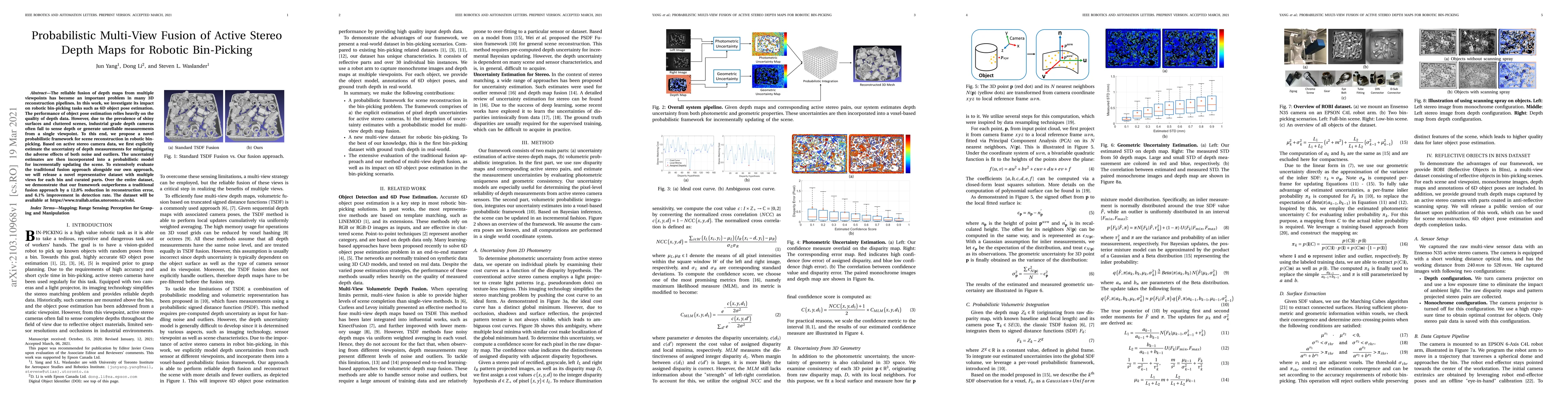 The reliable fusion of depth maps from multiple viewpoints has become an important problem in many 3D reconstruction pipelines. In this work, we investigate its impact on robotic bin-picking tasks such as 6D object pose estimation. The performance of object pose estimation relies heavily on the quality of depth data. However, due to the prevalence of shiny surfaces and cluttered scenes, industrial grade depth cameras often fail to sense depth or generate unreliable measurements from a single viewpoint. To this end, we propose a novel probabilistic framework for scene reconstruction in robotic bin-picking. Based on active stereo camera data, we first explicitly estimate the uncertainty of depth measurements for mitigating the adverse effects of both noise and outliers. The uncertainty estimates are then incorporated into a probabilistic model for incrementally updating the scene. To extensively evaluate the traditional fusion approach alongside our own approach, we will release a novel representative dataset with multiple views for each bin and curated parts. Over the entire dataset, we demonstrate that our framework outperforms a traditional fusion approach by a 12.8% reduction in reconstruction error, and 6.1% improvement in detection rate. The dataset will be available at https://www.trailab.utias.utoronto.ca/robi.
