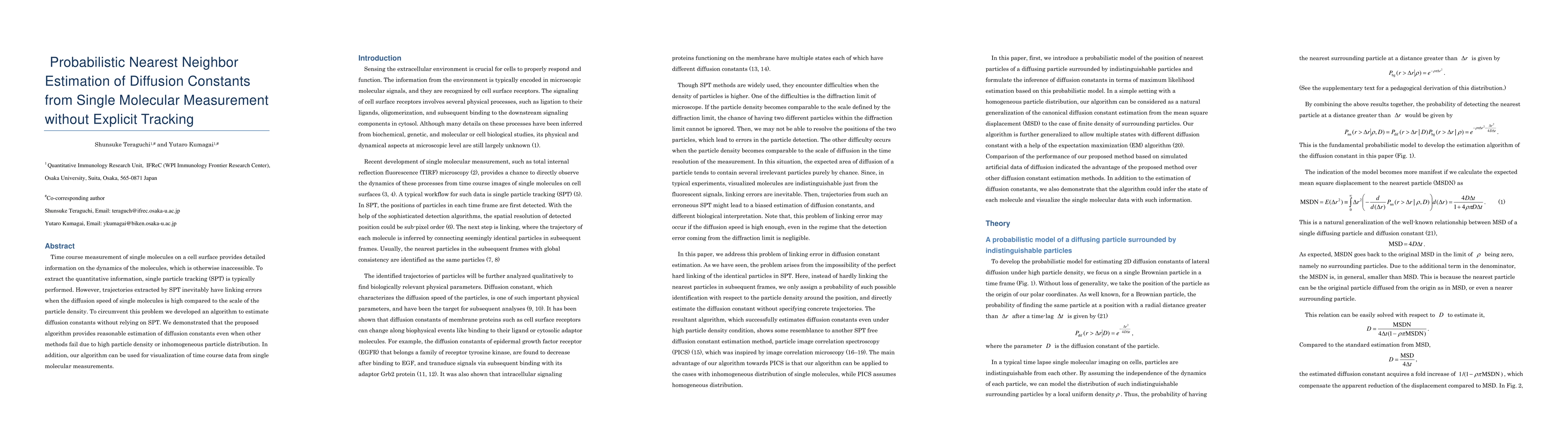 Time course measurement of single molecules on a cell surface provides detailed information on the dynamics of the molecules, which is otherwise inaccessible. To extract the quantitative information, single particle tracking (SPT) is typically performed. However, trajectories extracted by SPT inevitably have linking errors when the diffusion speed of single molecules is high compared to the scale of the particle density. To circumvent this problem we developed an algorithm to estimate diffusion constants without relying on SPT. We demonstrated that the proposed algorithm provides reasonable estimation of diffusion constants even when other methods fail due to high particle density or inhomogeneous particle distribution. In addition, our algorithm can be used for visualization of time course data from single molecular measurements.