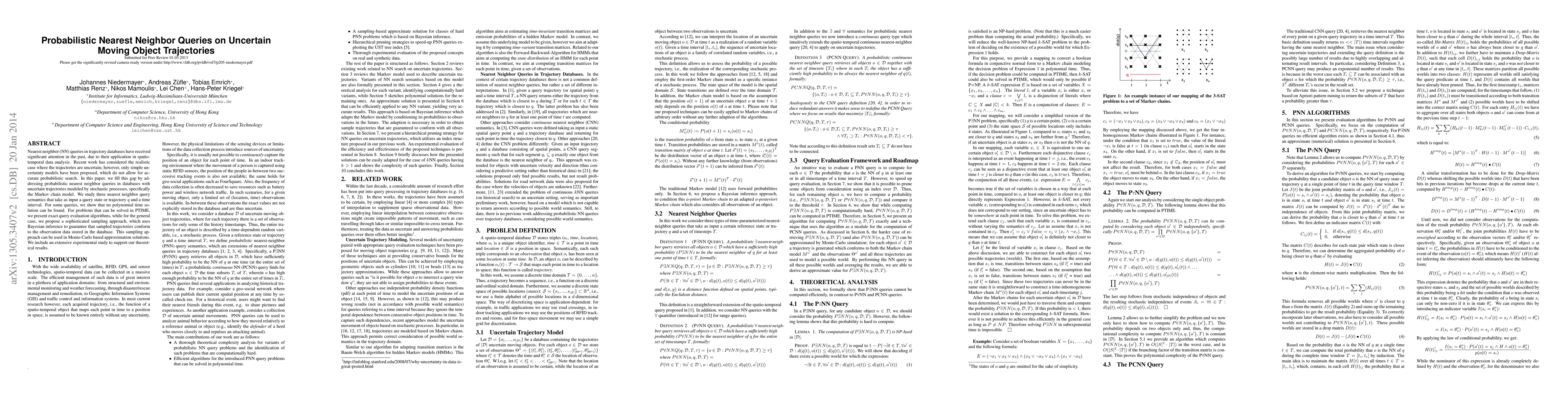 This paper addresses probabilistic nearest neighbor queries for uncertain moving object trajectories modeled by Markov chains. It presents exact algorithms for solvable cases and a sophisticated sampling approach using Bayesian inference for others, supplemented by an extensive experimental validation.