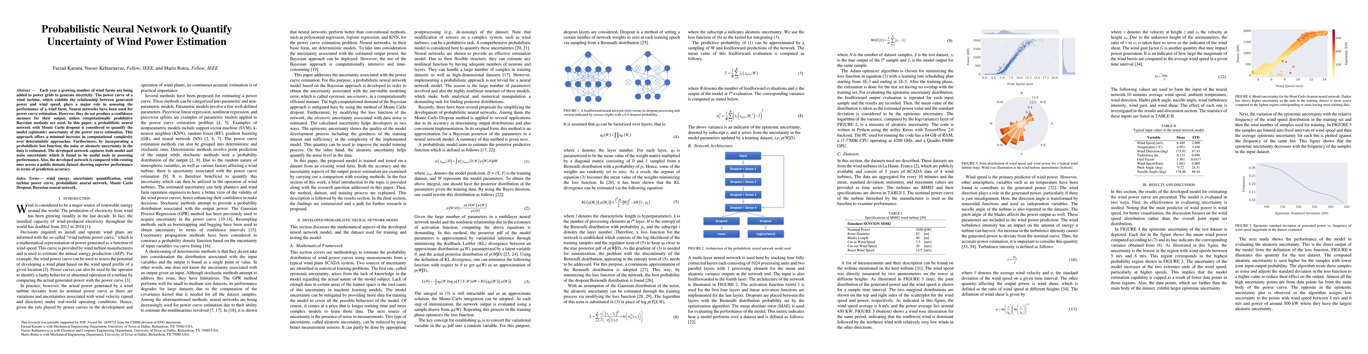 This paper proposes a probabilistic neural network with Monte Carlo dropout to quantify uncertainty in wind power estimation, capturing both model and noise uncertainties. The approach demonstrates superior performance compared to existing methods, offering valuable tools for assessing wind turbine performance.