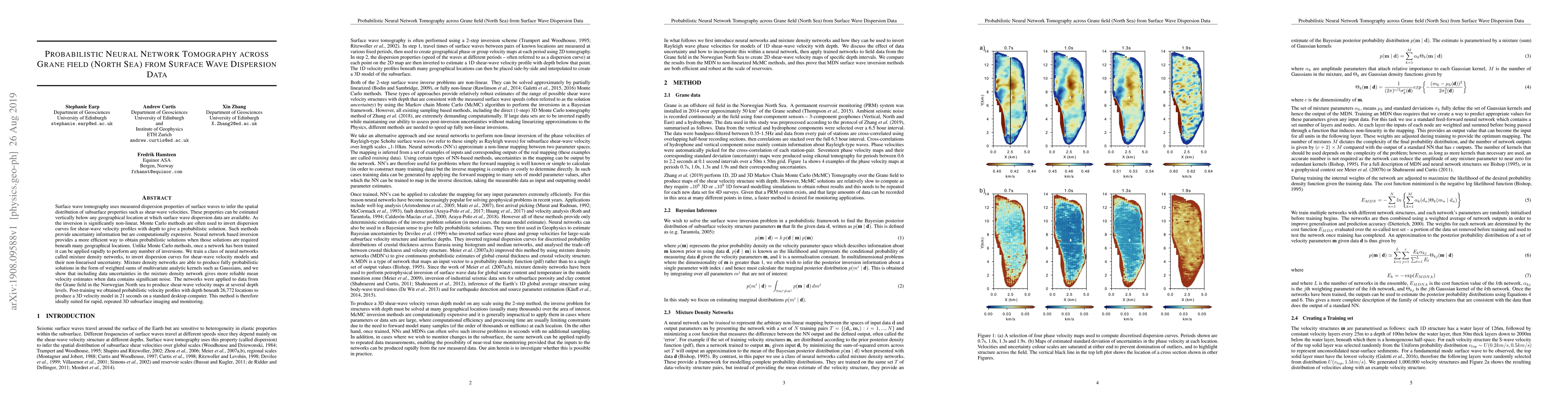 Surface wave tomography uses measured dispersion properties of surface waves to infer the spatial distribution of subsurface properties such as shear-wave velocities. These properties can be estimated vertically below any geographical location at which surface wave dispersion data are available. As the inversion is significantly non-linear, Monte Carlo methods are often used to invert dispersion curves for shear-wave velocity profiles with depth to give a probabilistic solution. Such methods provide uncertainty information but are computationally expensive. Neural network based inversion provides a more efficient way to obtain probabilistic solutions when those solutions are required beneath many geographical locations. Unlike Monte Carlo methods, once a network has been trained it can be applied rapidly to perform any number of inversions. We train a class of neural networks called mixture density networks, to invert dispersion curves for shear-wave velocity models and their non-linearised uncertainty. Mixture density networks are able to produce fully probabilistic solutions in the form of weighted sums of multivariate analytic kernels such as Gaussians, and we show that including data uncertainties in the mixture density network gives more reliable mean velocity estimates when data contains significant noise. The networks were applied to data from the Grane field in the Norwegian North sea to produce shear-wave velocity maps at several depth levels. Post-training we obtained probabilistic velocity profiles with depth beneath 26,772 locations to produce a 3D velocity model in 21 seconds on a standard desktop computer. This method is therefore ideally suited for rapid, repeated 3D subsurface imaging and monitoring.