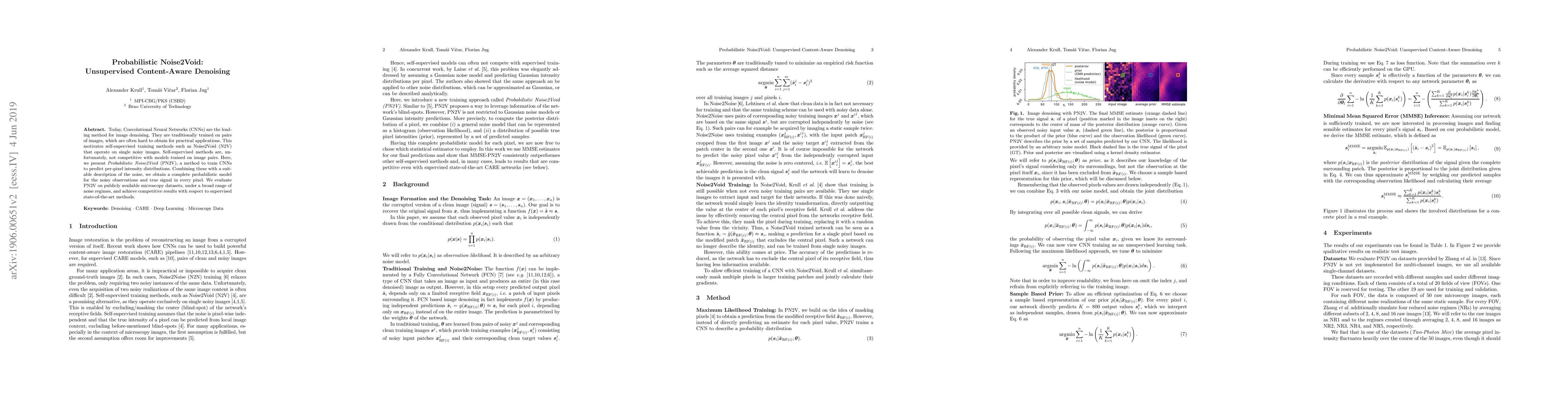A new self-supervised image denoising method called Probabilistic Noise2Void achieves competitive results with traditional supervised methods on publicly available microscopy datasets.