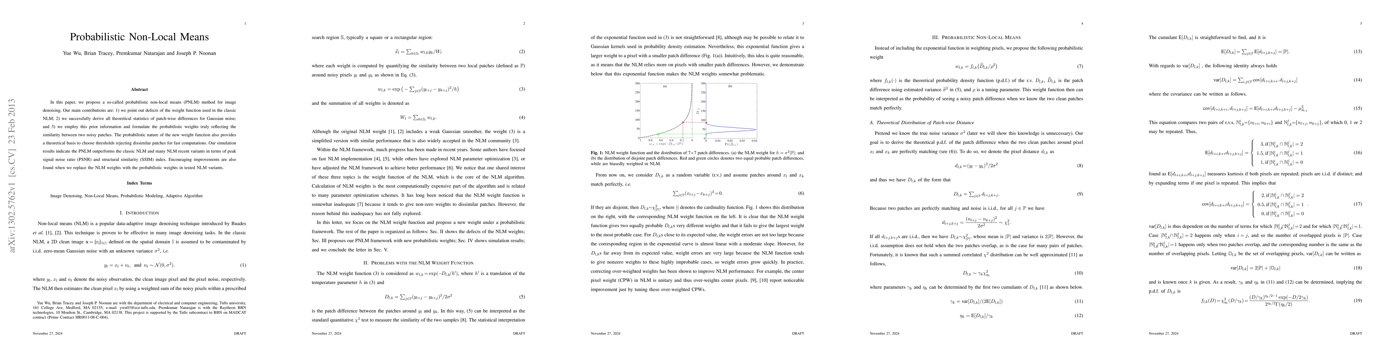 The paper proposes a probabilistic non-local means (PNLM) method for image denoising, addressing flaws in the classic NLM's weight function, deriving theoretical statistics for Gaussian noise, and formulating probabilistic weights that better reflect patch similarity. Simulation results show PNLM outperforms classic NLM and recent variants in PSNR and SSIM.