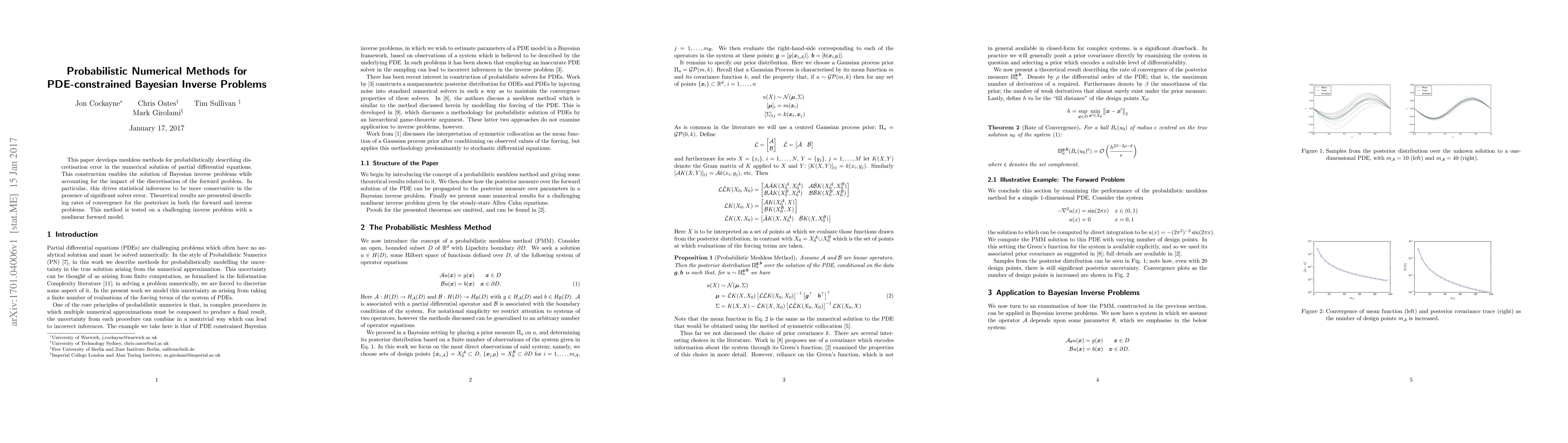 This paper introduces meshless probabilistic numerical methods for PDE-constrained Bayesian inverse problems, enabling conservative statistical inferences by accounting for discretization errors. Theoretical convergence rates are provided and the method is validated through a challenging nonlinear inverse problem.