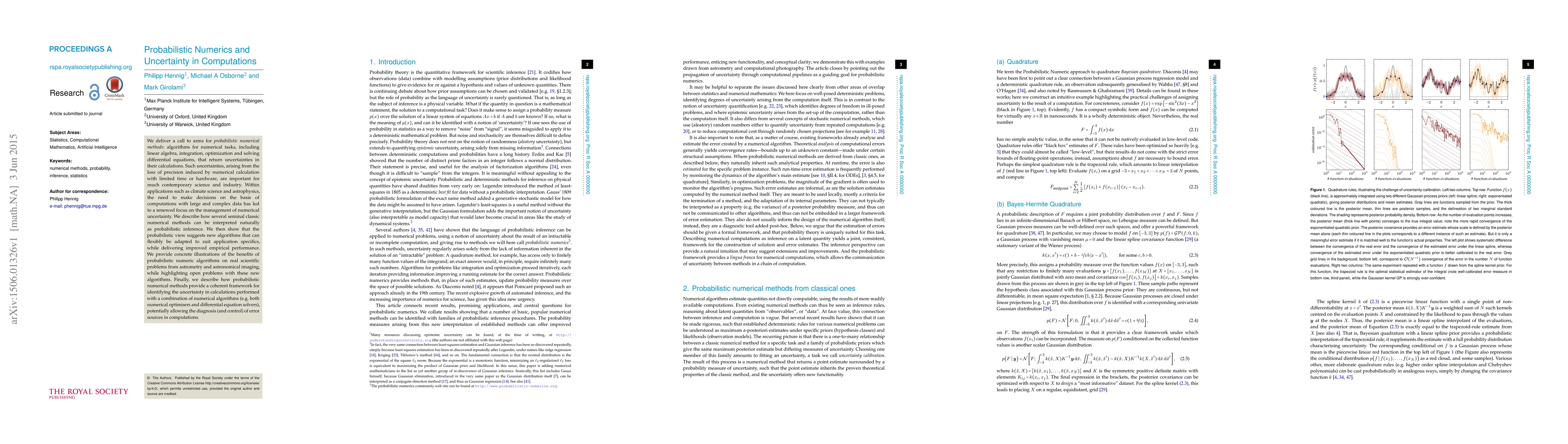 We deliver a call to arms for probabilistic numerical methods: algorithms for numerical tasks, including linear algebra, integration, optimization and solving differential equations, that return uncertainties in their calculations. Such uncertainties, arising from the loss of precision induced by numerical calculation with limited time or hardware, are important for much contemporary science and industry. Within applications such as climate science and astrophysics, the need to make decisions on the basis of computations with large and complex data has led to a renewed focus on the management of numerical uncertainty. We describe how several seminal classic numerical methods can be interpreted naturally as probabilistic inference. We then show that the probabilistic view suggests new algorithms that can flexibly be adapted to suit application specifics, while delivering improved empirical performance. We provide concrete illustrations of the benefits of probabilistic numeric algorithms on real scientific problems from astrometry and astronomical imaging, while highlighting open problems with these new algorithms. Finally, we describe how probabilistic numerical methods provide a coherent framework for identifying the uncertainty in calculations performed with a combination of numerical algorithms (e.g. both numerical optimisers and differential equation solvers), potentially allowing the diagnosis (and control) of error sources in computations.