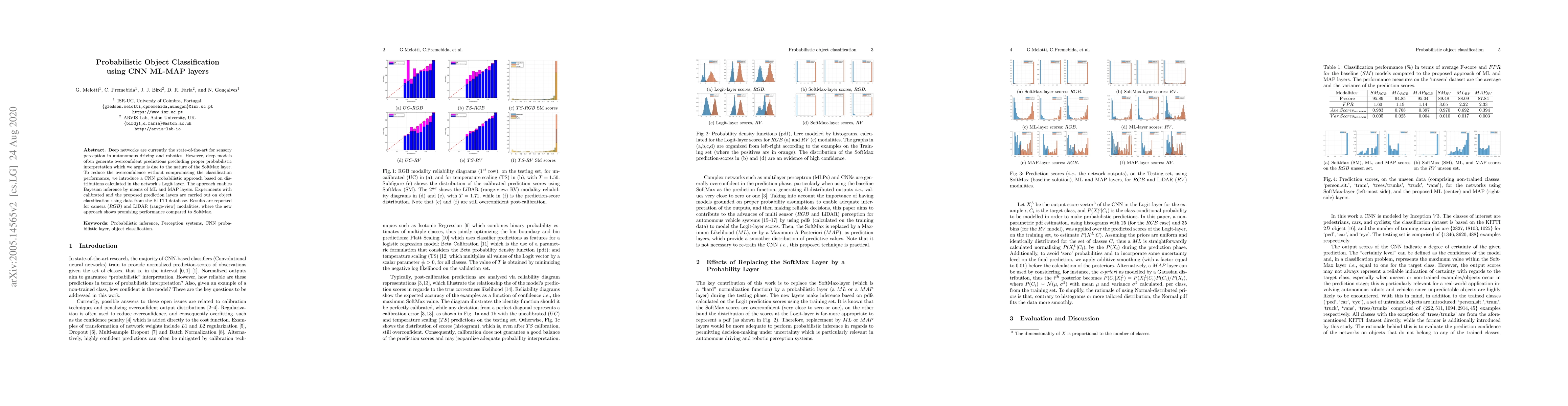 Deep networks are currently the state-of-the-art for sensory perception in autonomous driving and robotics. However, deep models often generate overconfident predictions precluding proper probabilistic interpretation which we argue is due to the nature of the SoftMax layer. To reduce the overconfidence without compromising the classification performance, we introduce a CNN probabilistic approach based on distributions calculated in the network's Logit layer. The approach enables Bayesian inference by means of ML and MAP layers. Experiments with calibrated and the proposed prediction layers are carried out on object classification using data from the KITTI database. Results are reported for camera ($RGB$) and LiDAR (range-view) modalities, where the new approach shows promising performance compared to SoftMax.