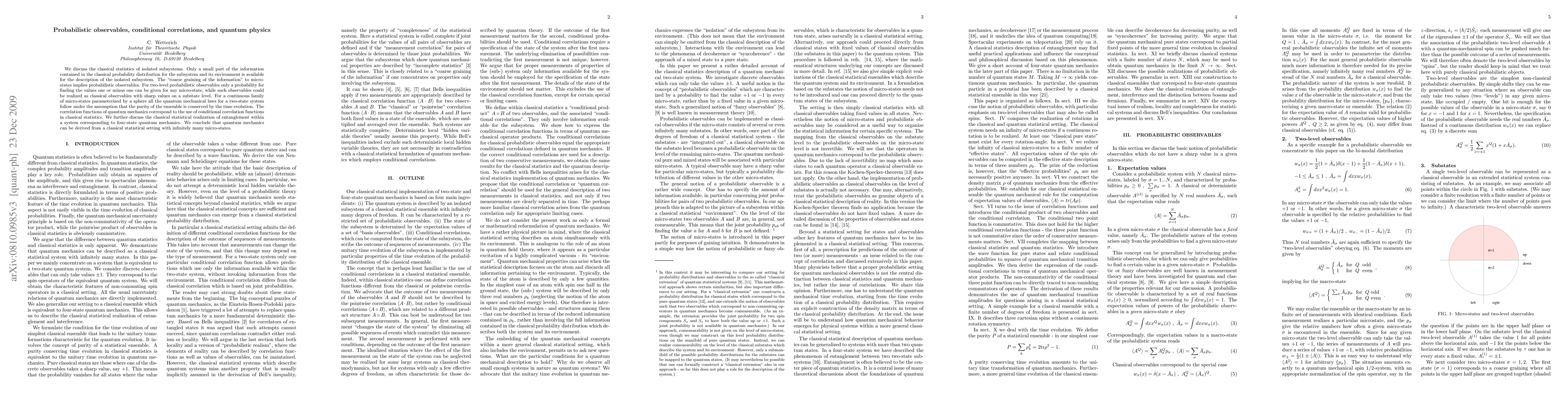 We discuss the classical statistics of isolated subsystems. Only a small part of the information contained in the classical probability distribution for the subsystem and its environment is available for the description of the isolated subsystem. The "coarse graining of the information" to micro-states implies probabilistic observables. For two-level probabilistic observables only a probability for finding the values one or minus one can be given for any micro-state, while such observables can be realized as classical observables with sharp values on a substate level. For a continuous family of micro-states parameterized by a sphere all the quantum mechanical laws for a two-state system follow under the assumption that the purity of the ensemble is conserved by the time evolution. The non-commutative correlation functions of quantum mechanics correspond to the use of conditional correlation functions in classical statistics. We further discuss the classical statistical realization of entanglement within a system corresponding to four-state quantum mechanics. We conclude that quantum mechanics can be derived from a classical statistical setting with infinitely many micro-states.