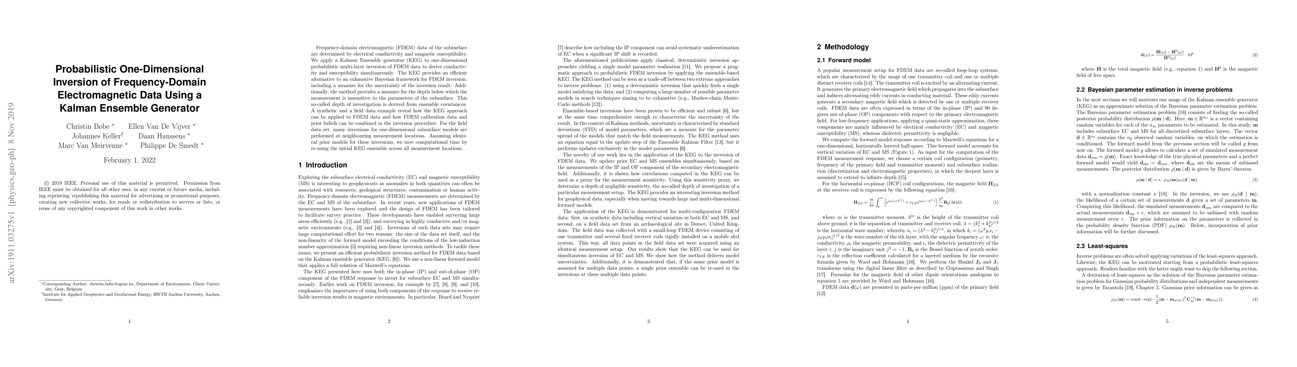 Frequency-domain electromagnetic (FDEM) data of the subsurface are determined by electrical conductivity and magnetic susceptibility. We apply a Kalman Ensemble generator (KEG) to one-dimensional probabilistic multi-layer inversion of FDEM data to derive conductivity and susceptibility simultaneously. The KEG provides an efficient alternative to an exhaustive Bayesian framework for FDEM inversion, including a measure for the uncertainty of the inversion result. Additionally, the method provides a measure for the depth below which the measurement is insensitive to the parameters of the subsurface. This so-called depth of investigation is derived from ensemble covariances. A synthetic and a field data example reveal how the KEG approach can be applied to FDEM data and how FDEM calibration data and prior beliefs can be combined in the inversion procedure. For the field data set, many inversions for one-dimensional subsurface models are performed at neighbouring measurement locations. Assuming identical prior models for these inversions, we save computational time by re-using the initial KEG ensemble across all measurement locations.