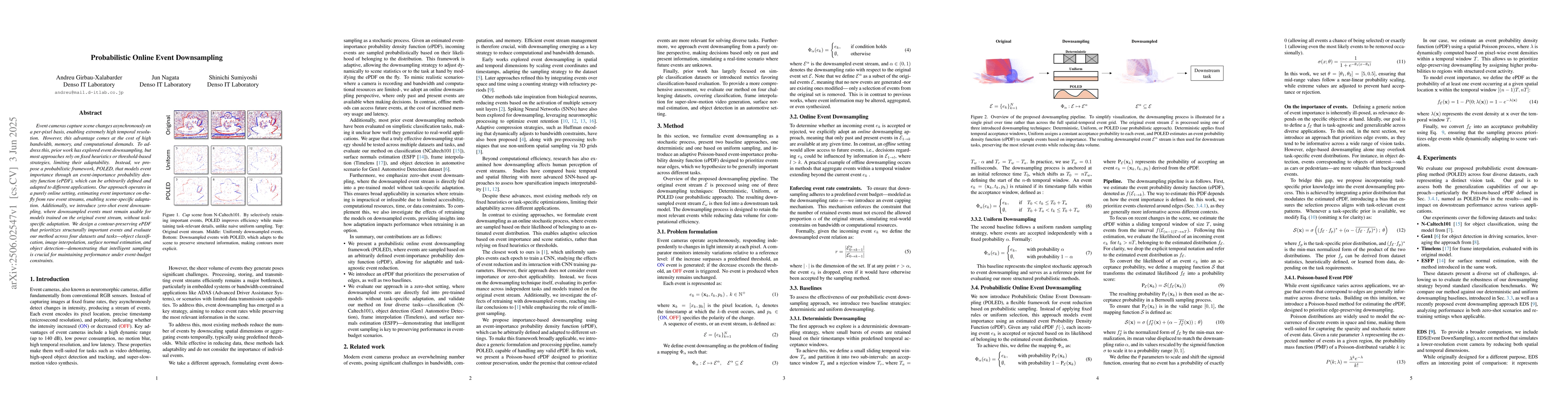 The research proposes POLED, a probabilistic framework for online event downsampling in event cameras. It models event importance via an event-importance probability density function (ePDF) that can be customized for various applications, estimating event significance on-the-fly from raw event streams for scene-specific adaptation.