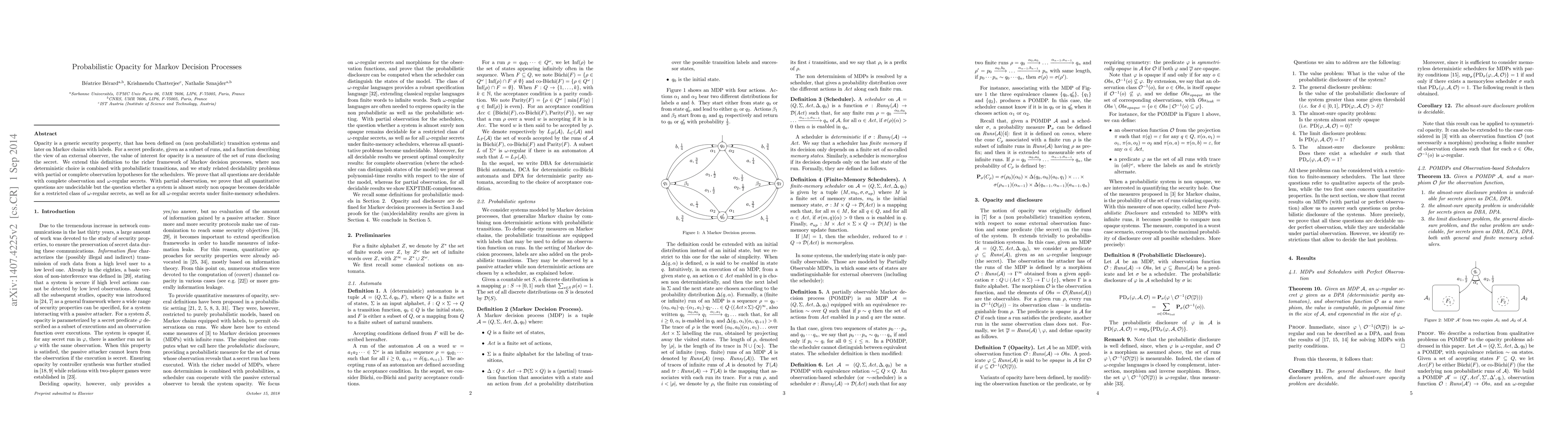 Opacity is a generic security property, that has been defined on (non probabilistic) transition systems and later on Markov chains with labels. For a secret predicate, given as a subset of runs, and a function describing the view of an external observer, the value of interest for opacity is a measure of the set of runs disclosing the secret. We extend this definition to the richer framework of Markov decision processes, where non deterministic choice is combined with probabilistic transitions, and we study related decidability problems with partial or complete observation hypotheses for the schedulers. We prove that all questions are decidable with complete observation and $\omega$-regular secrets. With partial observation, we prove that all quantitative questions are undecidable but the question whether a system is almost surely non opaque becomes decidable for a restricted class of $\omega$-regular secrets, as well as for all $\omega$-regular secrets under finite-memory schedulers.