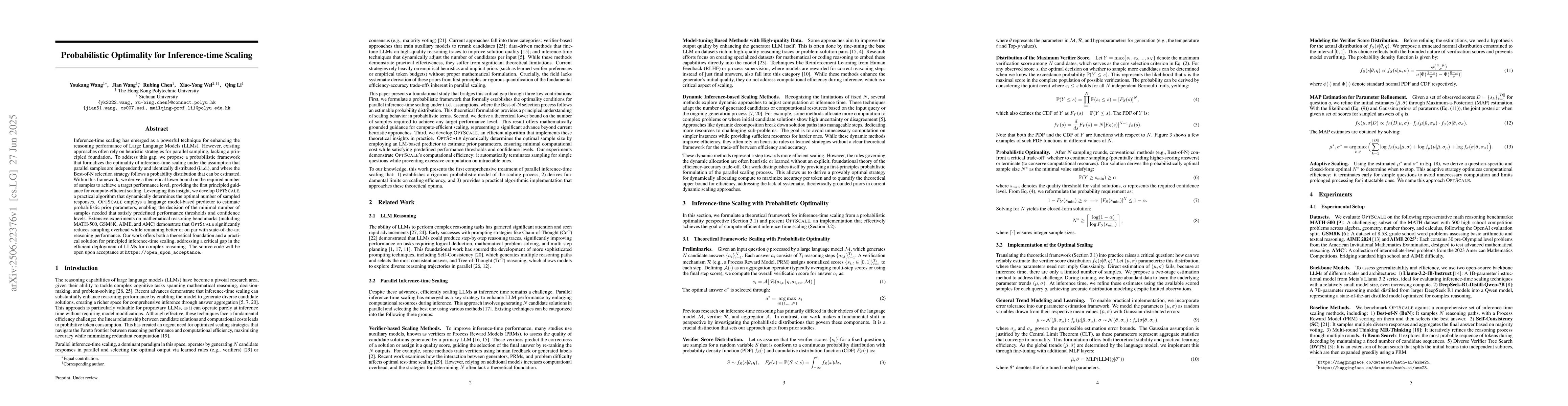 Inference-time scaling has emerged as a powerful technique for enhancing the reasoning performance of Large Language Models (LLMs). However, existing approaches often rely on heuristic strategies for parallel sampling, lacking a principled foundation. To address this gap, we propose a probabilistic framework that formalizes the optimality of inference-time scaling under the assumption that parallel samples are independently and identically distributed (i.i.d.), and where the Best-of-N selection strategy follows a probability distribution that can be estimated. Within this framework, we derive a theoretical lower bound on the required number of samples to achieve a target performance level, providing the first principled guidance for compute-efficient scaling. Leveraging this insight, we develop \textsc{OptScale}, a practical algorithm that dynamically determines the optimal number of sampled responses. \textsc{OptScale} employs a language model-based predictor to estimate probabilistic prior parameters, enabling the decision of the minimal number of samples needed that satisfy predefined performance thresholds and confidence levels. Extensive experiments on mathematical reasoning benchmarks (including MATH-500, GSM8K, AIME, and AMC) demonstrate that \textsc{OptScale} significantly reduces sampling overhead while remaining better or on par with state-of-the-art reasoning performance. Our work offers both a theoretical foundation and a practical solution for principled inference-time scaling, addressing a critical gap in the efficient deployment of LLMs for complex reasoning.