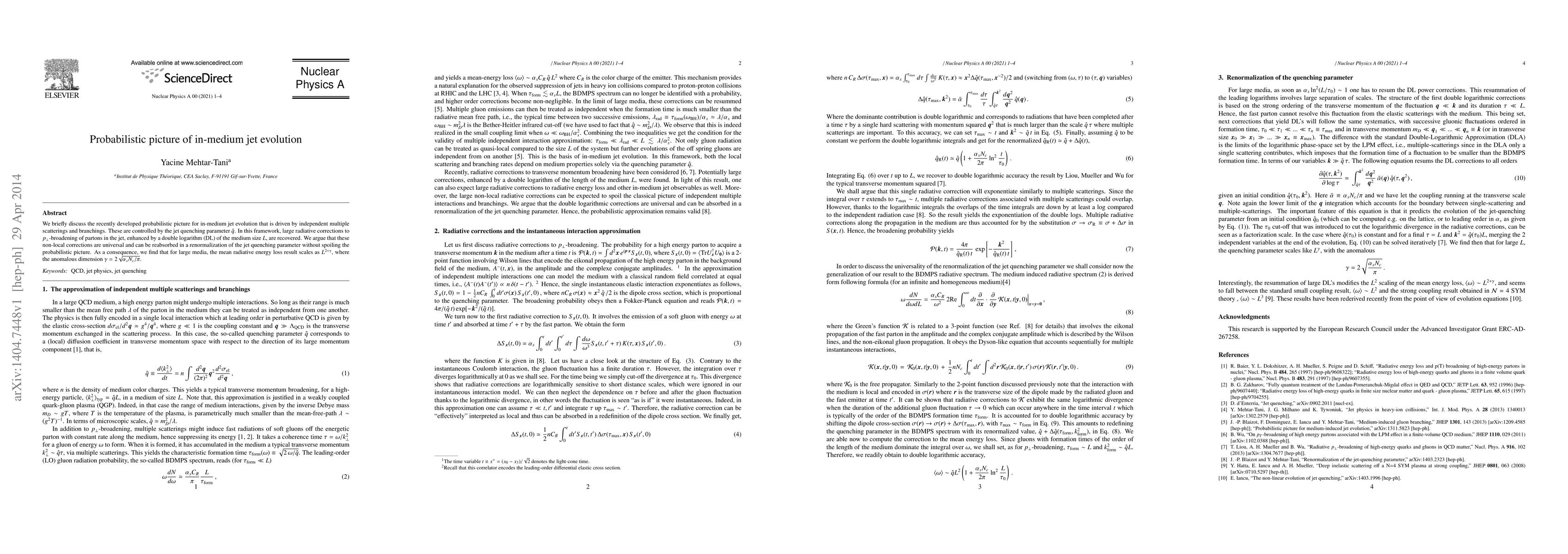 We briefly discuss the recently developed probabilistic picture for in-medium jet evolution that is driven by independent multiple scatterings and branchings. These are controlled by the jet quenching parameter $\hat q$. In this framework, large radiative corrections to $p_\perp$-broadening of partons in the jet, enhanced by a double logarithm (DL) of the medium size $L$, are recovered. We argue that these non-local corrections are universal and can be reabsorbed in a renormalization of the jet quenching parameter without spoiling the probabilistic picture. As a consequence, we find that for large media, the mean radiative energy loss result scales as $L^{2+\gamma}$, where the anomalous dimension $\gamma=2\sqrt{\alpha_sN_c/\pi}$.