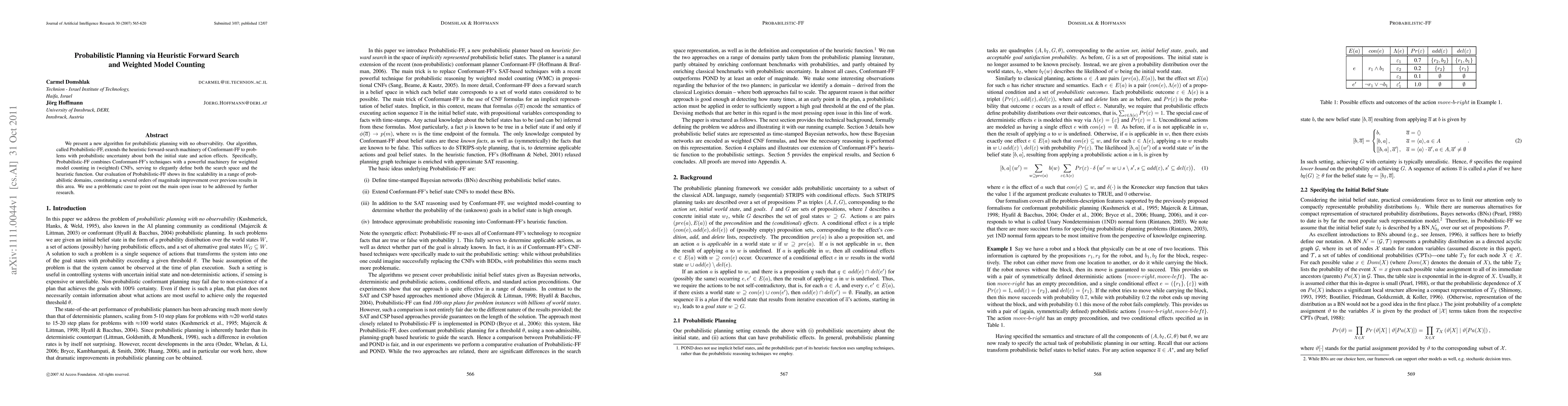 The research introduces Probabilistic-FF, an algorithm for probabilistic planning with no observability, extending heuristic forward-search machinery of Conformant-FF to handle uncertainty in both initial state and action effects using weighted model counting.