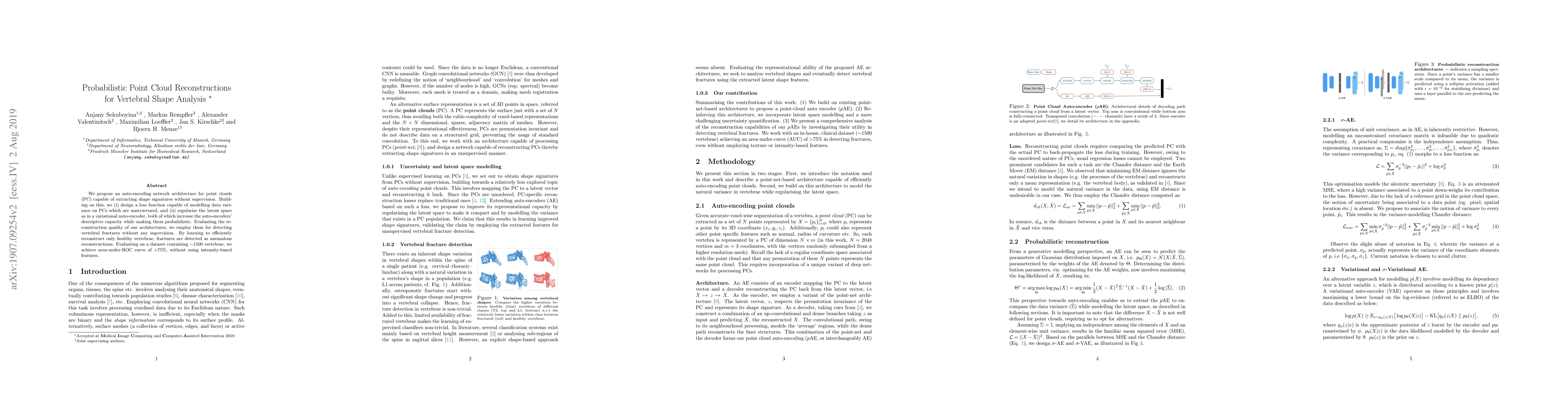We propose an auto-encoding network architecture for point clouds (PC) capable of extracting shape signatures without supervision. Building on this, we (i) design a loss function capable of modelling data variance on PCs which are unstructured, and (ii) regularise the latent space as in a variational auto-encoder, both of which increase the auto-encoders' descriptive capacity while making them probabilistic. Evaluating the reconstruction quality of our architectures, we employ them for detecting vertebral fractures without any supervision. By learning to efficiently reconstruct only healthy vertebrae, fractures are detected as anomalous reconstructions. Evaluating on a dataset containing $\sim$1500 vertebrae, we achieve area-under-ROC curve of $>$75%, without using intensity-based features.