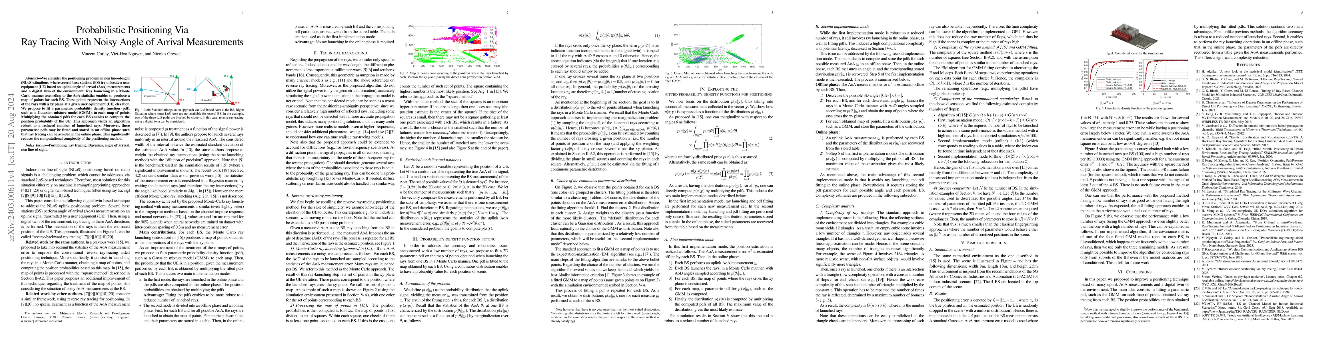 This paper proposes a method for positioning user equipment in non line-of-sight scenarios using probabilistic ray tracing and angle of arrival measurements. It fits a parametric probability density function to ray intersections, allowing computation of UE position probability robustly even with noisy measurements.