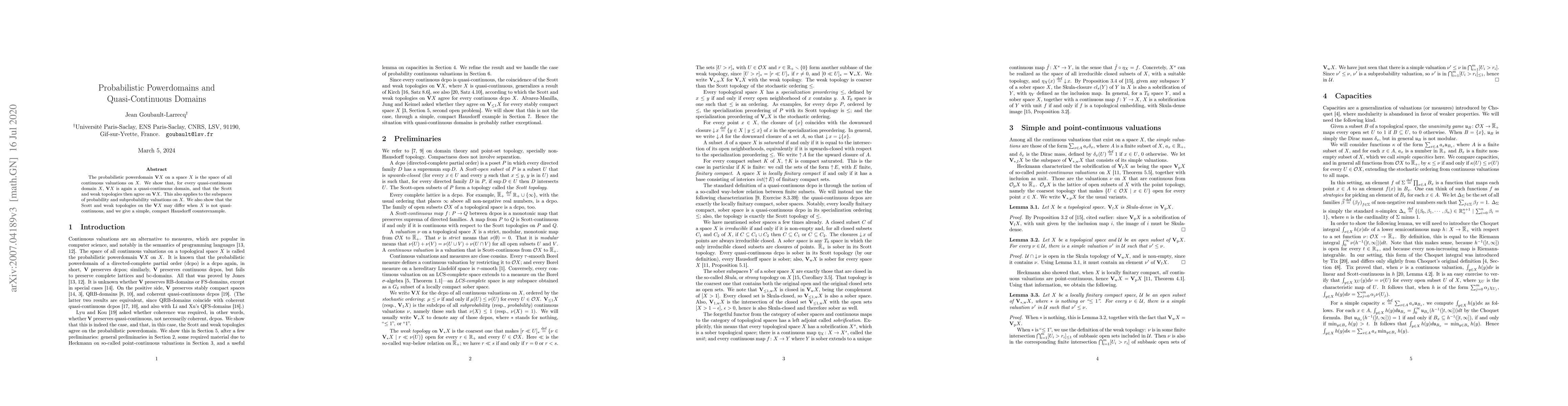 This paper demonstrates that the probabilistic powerdomain $\mathbf V X$ is a quasi-continuous domain when $X$ is quasi-continuous, with Scott and weak topologies agreeing. It also shows that these topologies may differ if $X$ is not quasi-continuous, providing a counterexample.